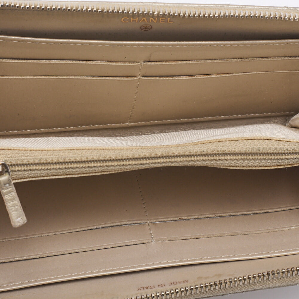 Dieses gebrauchte Portemonnaie weist einige Gebrauchsspuren auf, darunter eine leichte Oberflächenverdünnung und leichte Abnutzungsspuren im Inneren des Münzfachs, die seinen einzigartigen Charakter unterstreichen. Trotz dieser kleinen Mängel ist der Gesamtzustand beeindruckend und spiegelt die beständige Qualität wider, für die CHANEL bekannt ist.