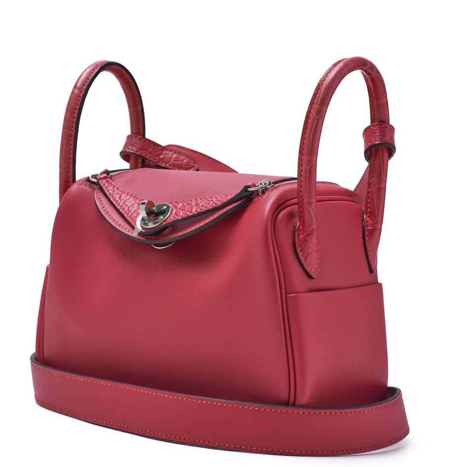 Wir präsentieren die HERMES Hermes Mini Lindy 18 2way Schultertasche aus luxuriösem Swift-Krokodilleder in einem atemberaubenden Rose Shocking- Farbton, ergänzt durch elegante silberne Beschläge. Diese exquisite Schultertasche ist perfekt für die moderne Frau, die Wert auf Stil und Funktionalität legt.