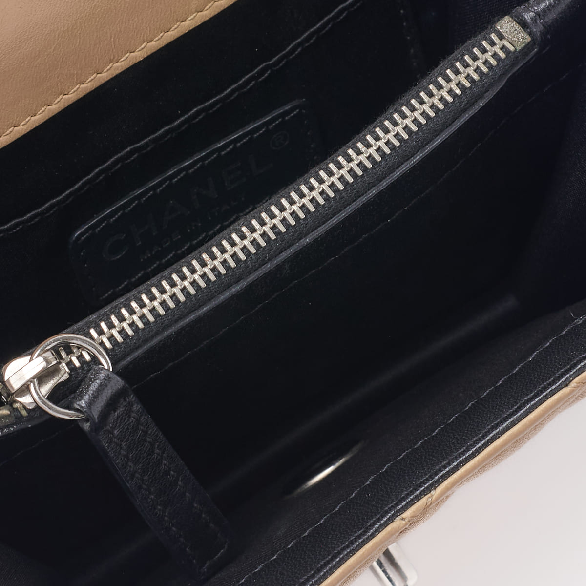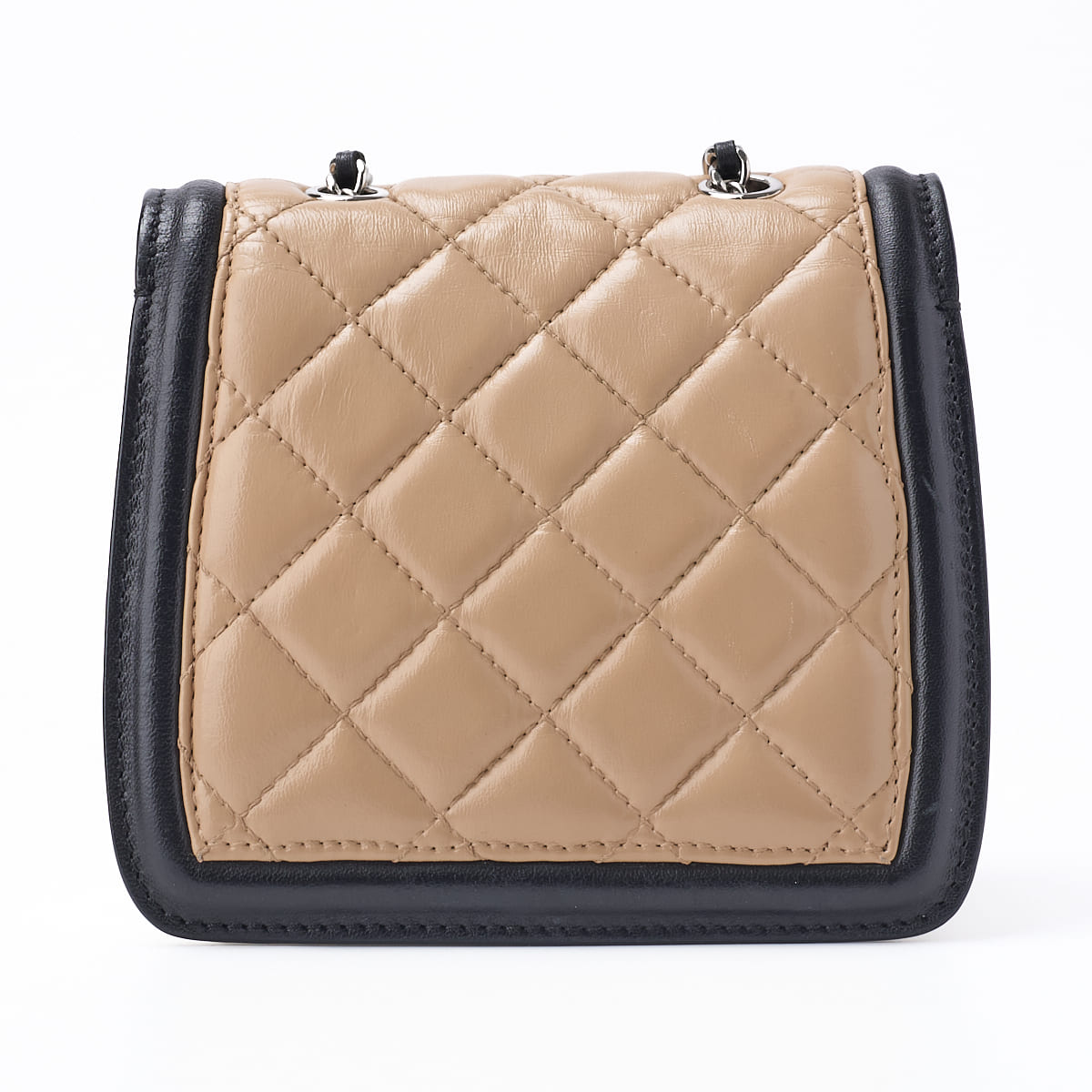 Gönnen Sie sich Luxus mit der CHANEL Mini Matelassé Turn Lock Chain Schultertasche . Sie ist meisterhaft aus geschmeidigem Lammleder in einer atemberaubenden Beige-Schwarz-Kombination mit eleganten Goldbeschlägen gefertigt. Diese exquisite Mini-Schultertasche ist nicht nur ein Accessoire; sie ist ein Statement-Stück, das Raffinesse und Stil verkörpert.