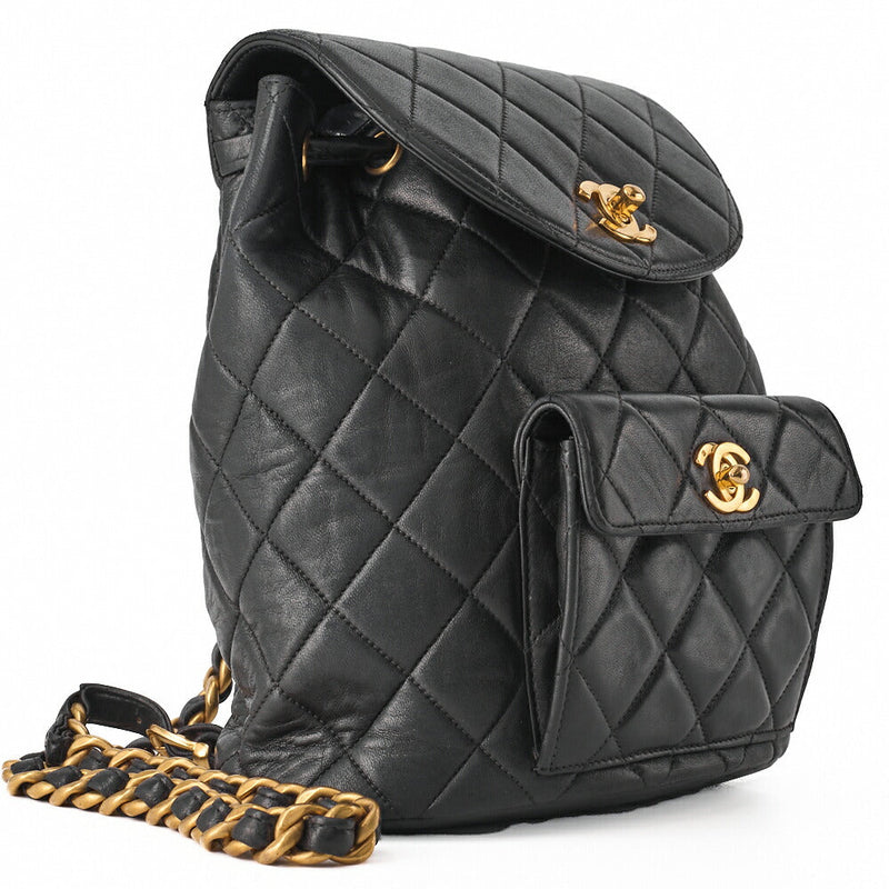 Gebrauchter Matlasse Rucksack mit Außenklappe und Drehverschluss und Kette aus Lammleder in Schwarz und Goldtönen, Gebraucht
