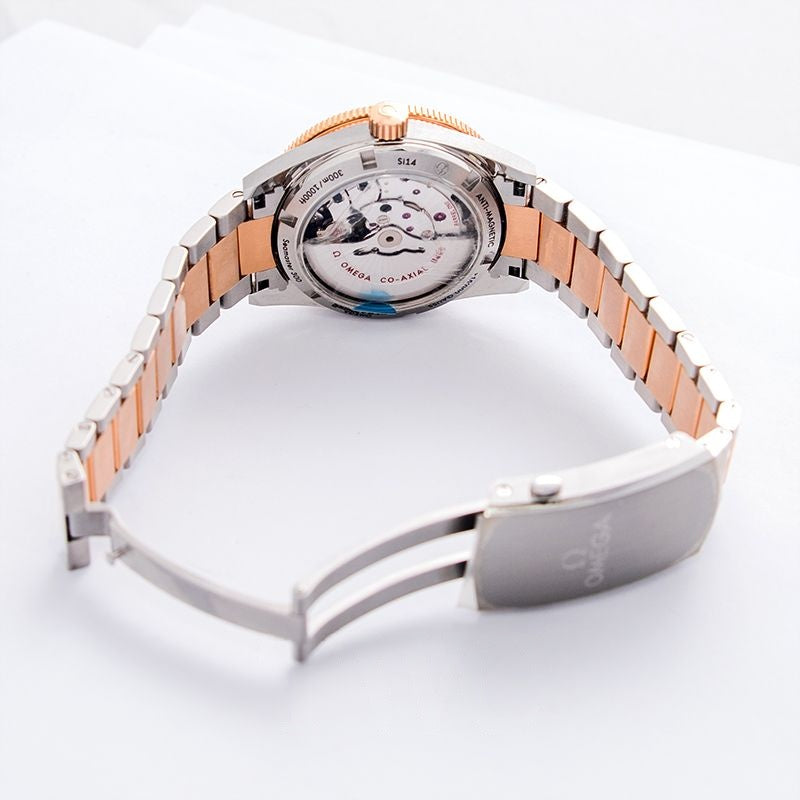 Die 1957 eingeführte OMEGA Seamaster 300 Master wurde für Taucher und Unterwassersportler entwickelt und gefertigt. Kürzlich hat das Unternehmen die Form eines seiner besten Produkte überarbeitet und verbessert, und heute ist die Uhr 233.20.41.21.01.001 ein wahrer Inbegriff von Perfektion. Das 41-mm-Edelstahlgehäuse ist mit einem markanten und eleganten Armband aus 18-karätigem Gold und Edelstahl ausgestattet. Der Gehäuseboden ist transparent und gibt den Blick auf das antimagnetische Omega Master Co-Axial Kaliber 8400 frei, das über eine Gangreserve von 60 Stunden verfügt. Die schwarze Lünette und das schwarze Zifferblatt bilden einen Kontrast zu den helleren Tönen der Uhr. Erstere verfügt über einen goldenen Außenring und eine Tauchskala, letztere über roségoldfarbene Indizes und Zeiger.
