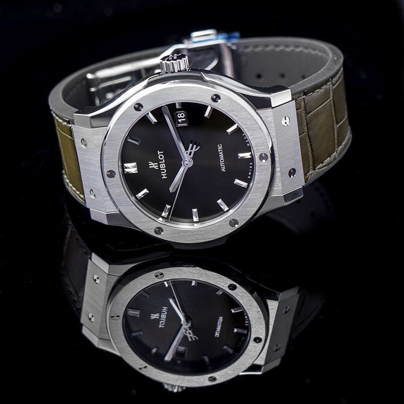 Hublot kombiniert feinste Mikrokomponenten für die Hublot Classic Green Titanium Uhr, die mit ihrem schönen und stilvollen Design modische Akzente setzt. Die 42 mm große Uhr 542.NX.8970.LR besticht durch ein wunderschön satiniertes und poliertes Gehäuse. Das grüne Lederarmband mit schwarzer Kautschukeinlage bietet höchsten Tragekomfort. Das Highlight dieser Kreation des Schweizer Uhrenherstellers ist das grüne Zifferblatt mit Sonnenschliff, dessen Attraktivität durch die Satinierung noch verstärkt wird. Das Zifferblatt verfügt über ein Datumsfenster auf 3 Uhr sowie silberfarbene Zeiger und Indexe. Angetrieben wird die Uhr vom charakteristischen Automatikwerk HUB1110 mit 42 Stunden Gangreserve. Dank ihrer Wasserdichtigkeit zählt die Hublot Classic Green Titanium zu den langlebigsten Uhren der Classic Fusion-Reihe.