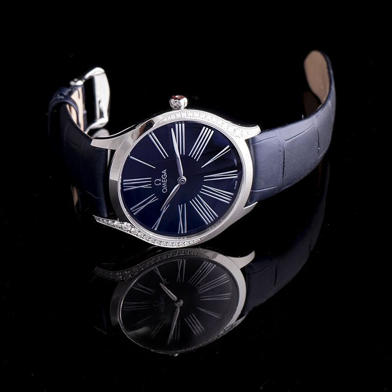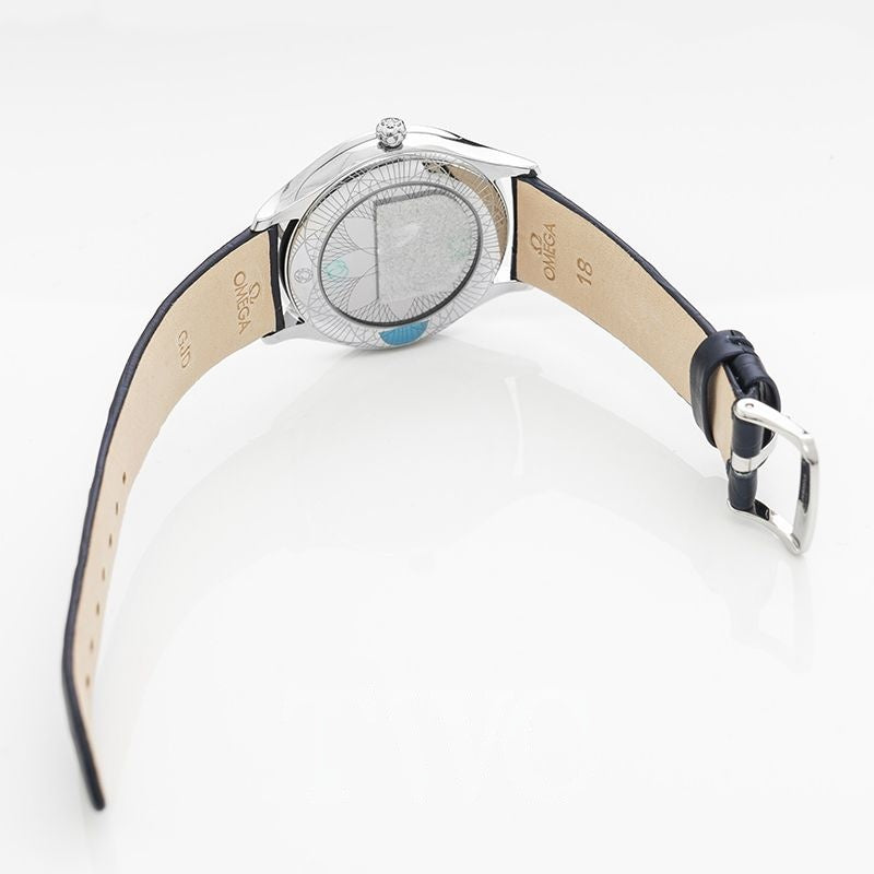 Die OMEGA De Ville Tr?sor Quartz 428.18.36.60.03.001 besticht durch ihr zeitgenössisches Design und verleiht ihr einen wahrhaft modernen Touch. Die 36-mm-Uhr mit Edelstahlgehäuse verfügt über ein blau lackiertes Zifferblatt mit übergroßen, übertragenen römischen Ziffern als Stundenmarkierungen. Rhodinierte Zeiger verleihen dem Zifferblatt zusätzliche Eleganz und machen es gleichzeitig funktionaler. Die geschwungenen Gehäuseformen sind mit Diamanten besetzt und verleihen dem Zifferblatt einen majestätischen Look. Die diamantbesetzte Krone, die mit roter „HyCeram“ poliert ist, unterstreicht den Reiz zusätzlich. Diese elegante Diamantuhr für Damen wird an einem blauen Lederarmband präsentiert. Hinter dem Gehäuseboden verbirgt sich das OMEGA Kaliber 4061, verziert mit einem einzigartigen Muster namens „Her Time“.