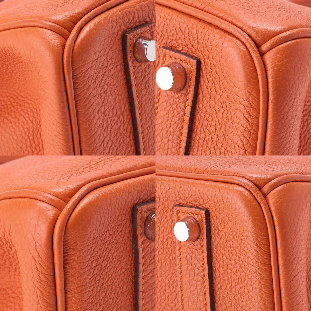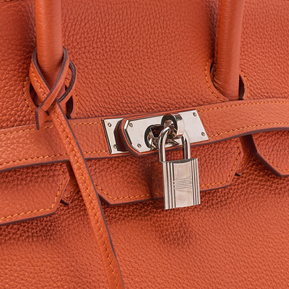 Erweitern Sie Ihre Accessoire-Kollektion mit der exquisiten HERMES Birkin 35 Handtasche in atemberaubendem Togo-Orange . Diese ikonische Damentasche mit eleganten silbernen Metallbeschlägen ist perfekt für die moderne Frau, die Luxus und Eleganz schätzt.