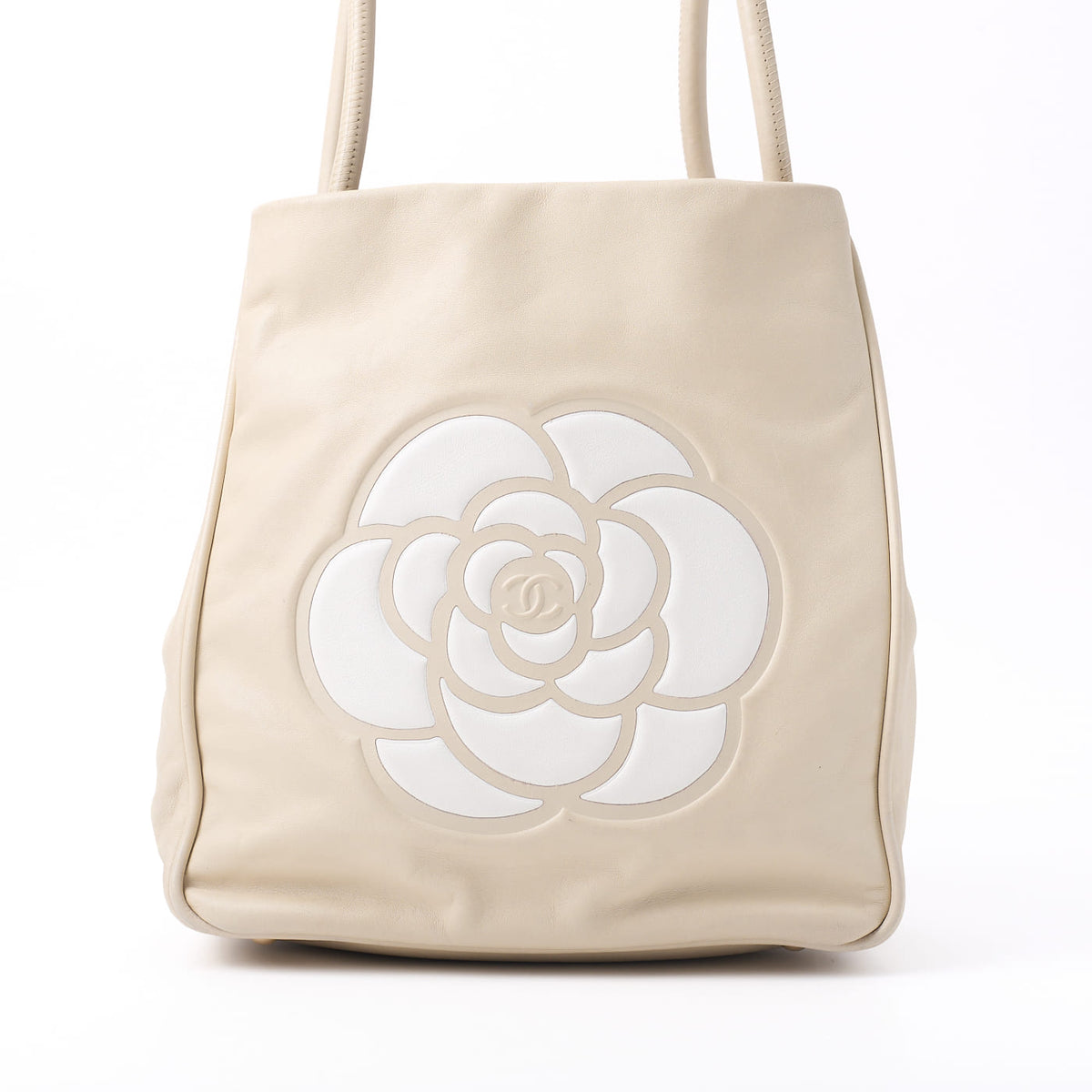 Erweitern Sie Ihre Accessoire-Kollektion mit der exquisiten CHANEL Camellia Line Tote Bag aus luxuriösem Lammleder in atemberaubendem Elfenbeinton, abgerundet durch elegante Goldbeschläge. Diese hochwertige Damen-Tragetasche ist nicht nur ein Allrounder, sondern ein Statement-Piece, das Raffinesse und zeitlosen Stil verkörpert.