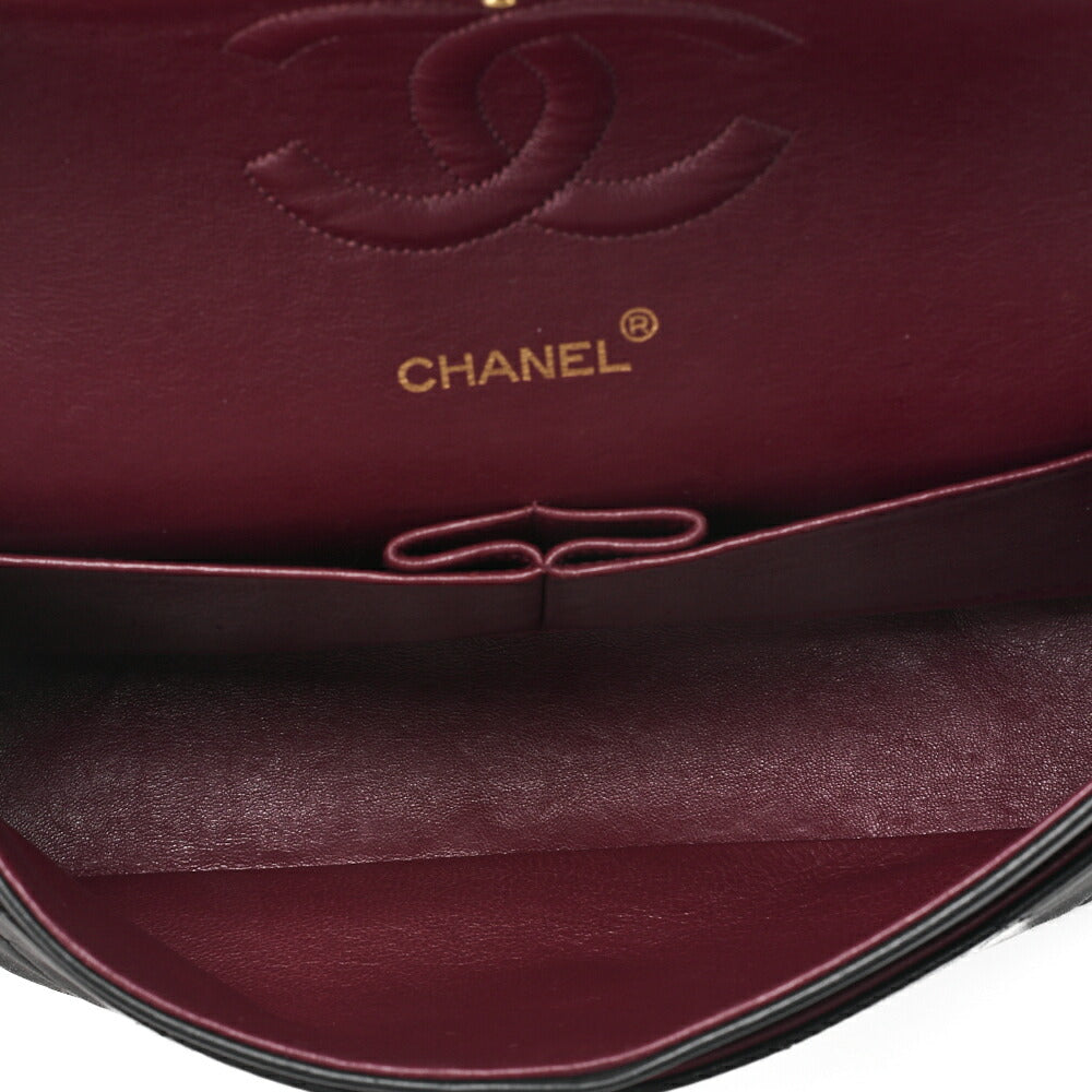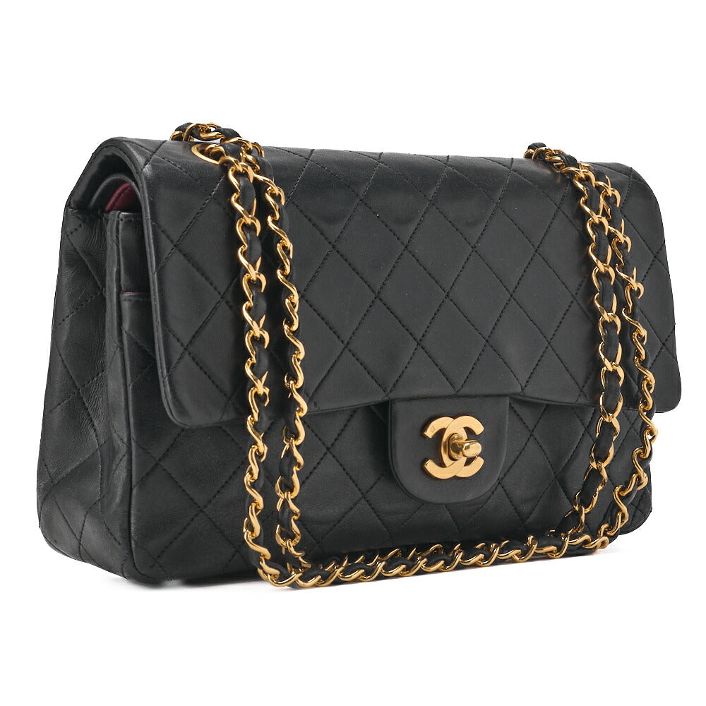 Veredeln Sie Ihren Stil mit der CHANEL Chain Shoulder Bag Matelassé Double Flap . Diese exquisite Tasche in elegantem Schwarz aus edlem Lammleder besticht durch luxuriöse Goldbeschläge , die jedem Outfit einen Hauch von Raffinesse verleihen. Mit einer Größe von ca. 25 cm (B x H x T) x 7 cm ist sie kompakt und dennoch geräumig genug für alles Wichtige.