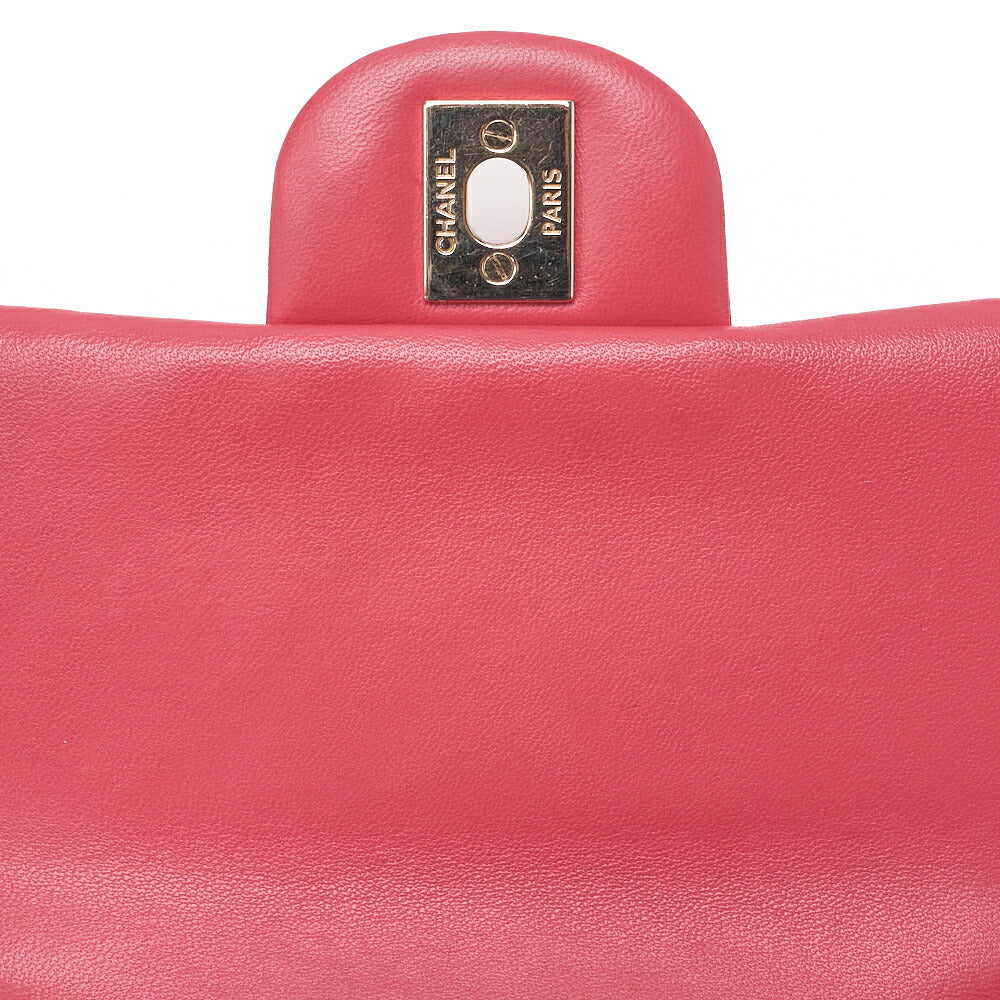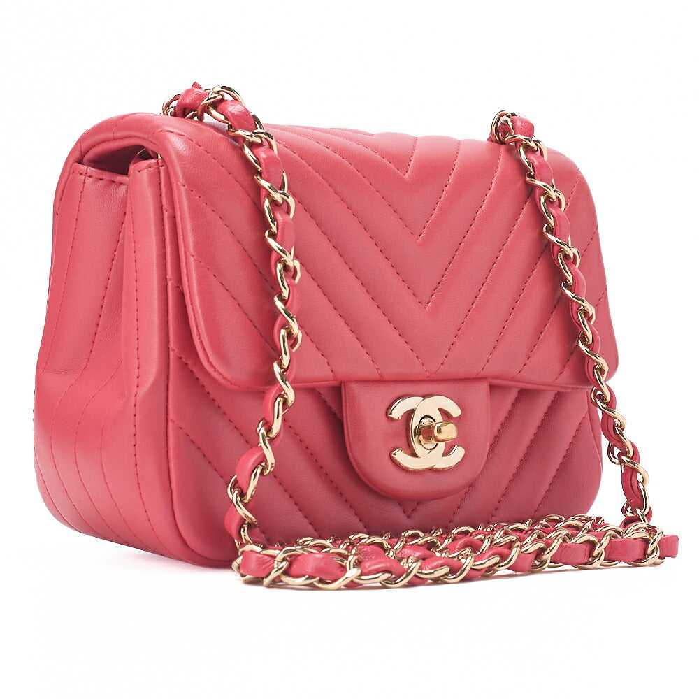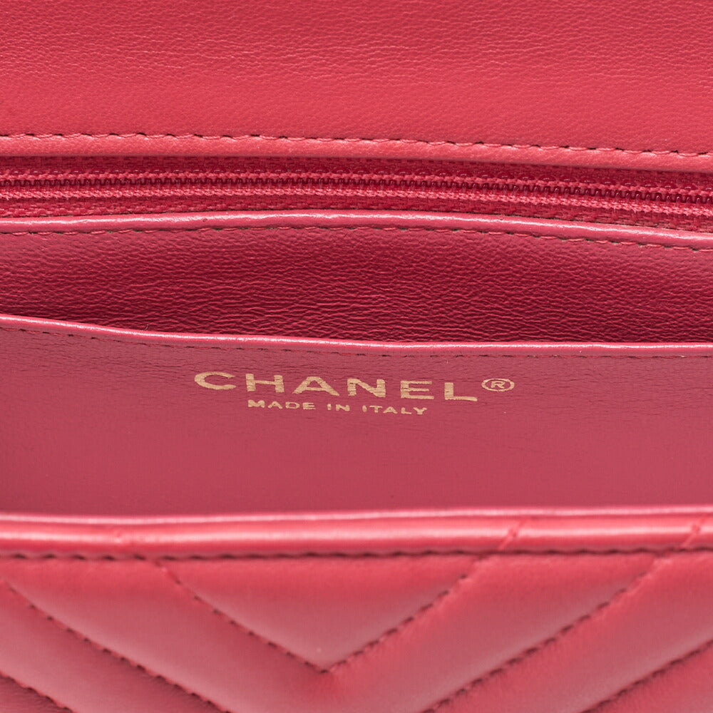 - Red lambskin with V-Stitch and gold-tone hardware for timeless Chanel appeal.