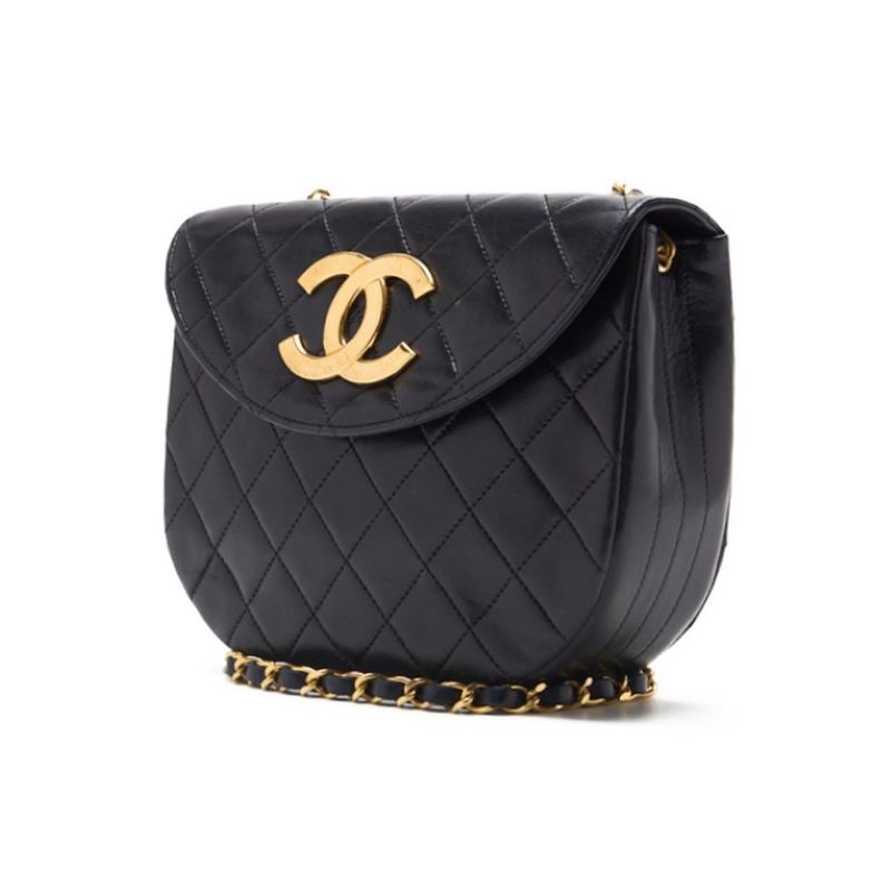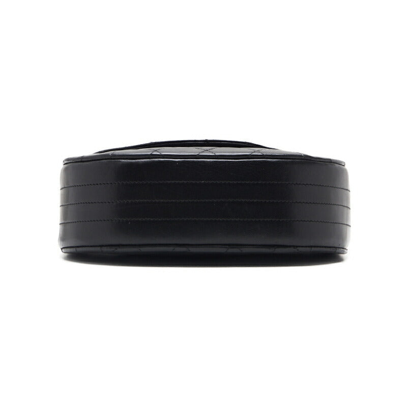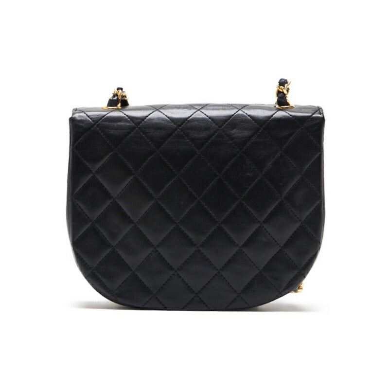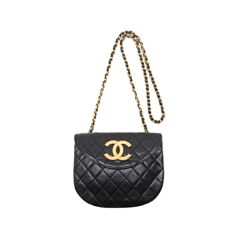 Gebrauchte Umhängetasche, Deca Coco Round Flap Push Lock Chain Shoulder, Lammleder, Schwarz, Goldfarbene Metallteile, Gebraucht