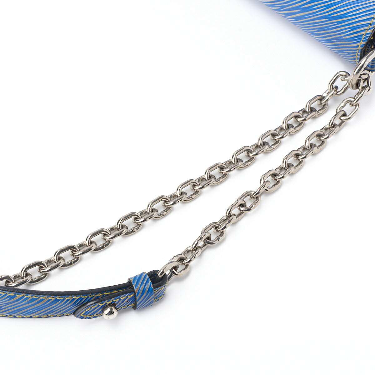 Erweitern Sie Ihre Accessoire-Auswahl mit der LOUIS VUITTON Epi Twist MM Chain Shoulder Bag – einer atemberaubenden Kombination aus Luxus und Funktionalität. Gefertigt aus hochwertigem Epi-Leder in einem wunderschönen Denim-Light- Ton, besticht diese Umhängetasche durch ihr elegantes Design mit silbernen und goldenen Beschlägen, die jedem Outfit einen Hauch von Raffinesse verleihen.