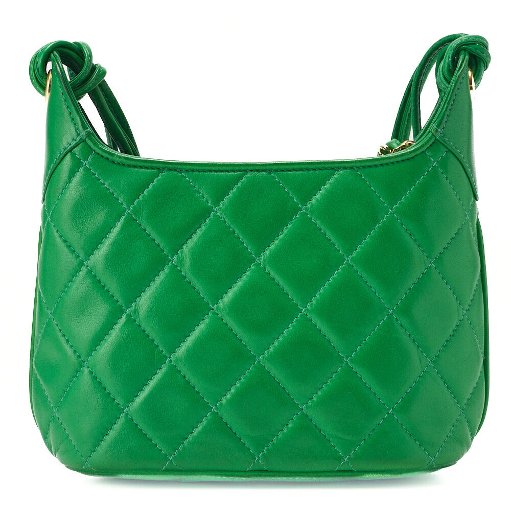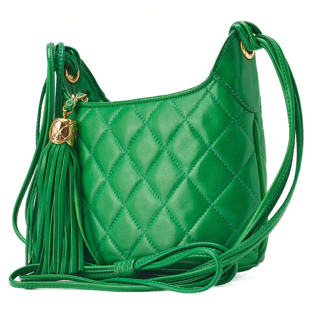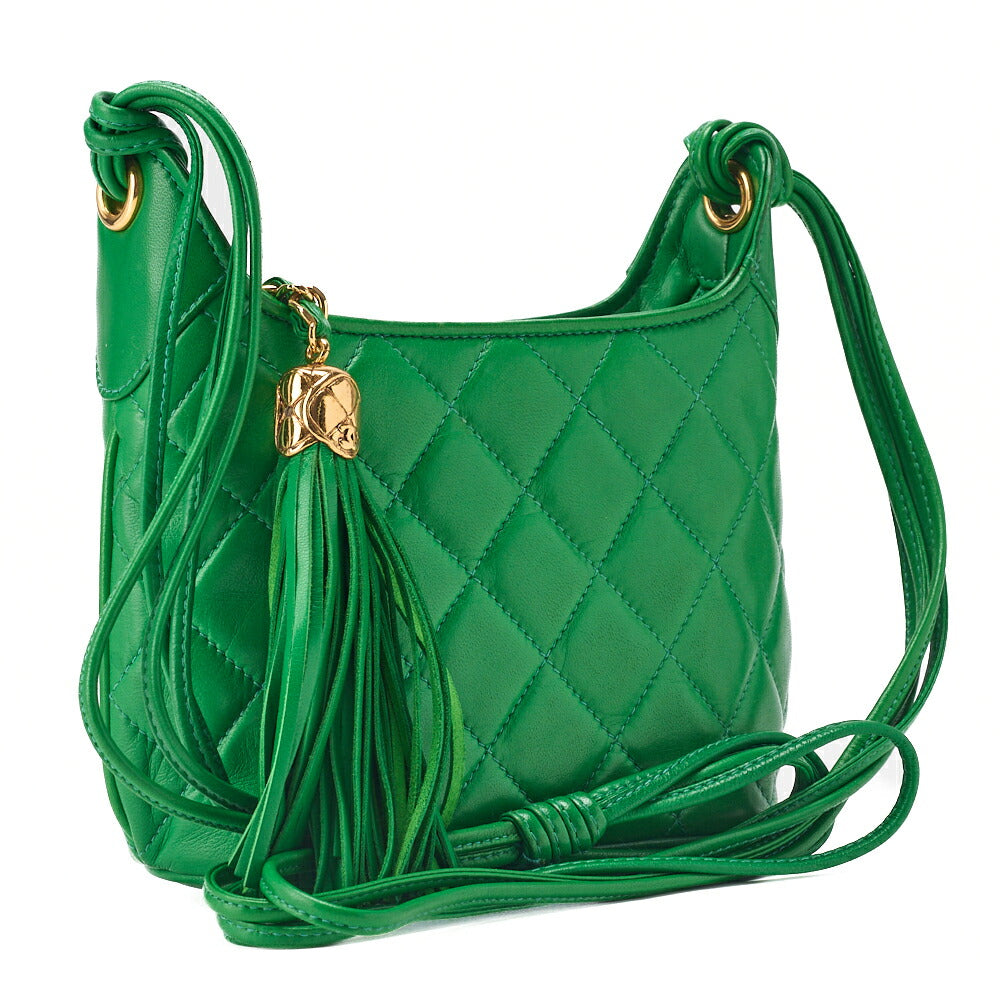 Gebrauchte Umhängetasche, Matelassé-Fransen, Lammleder, Grün, Goldfarbene Metallteile, Gebraucht