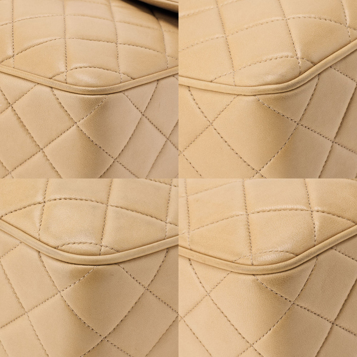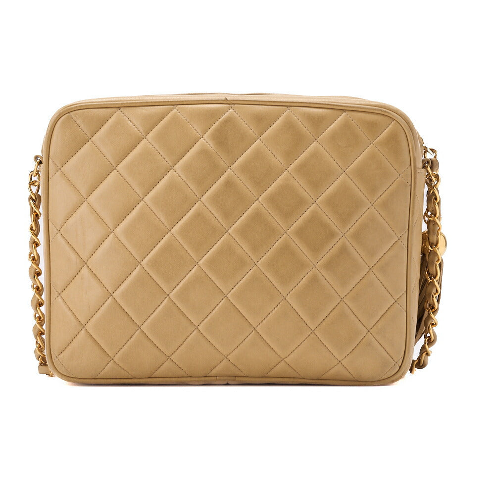 Gebrauchte Umhängetasche, Matelassé-Außenklappe mit Fransen, Lammleder, Beige, goldfarbene Metallteile, gebraucht