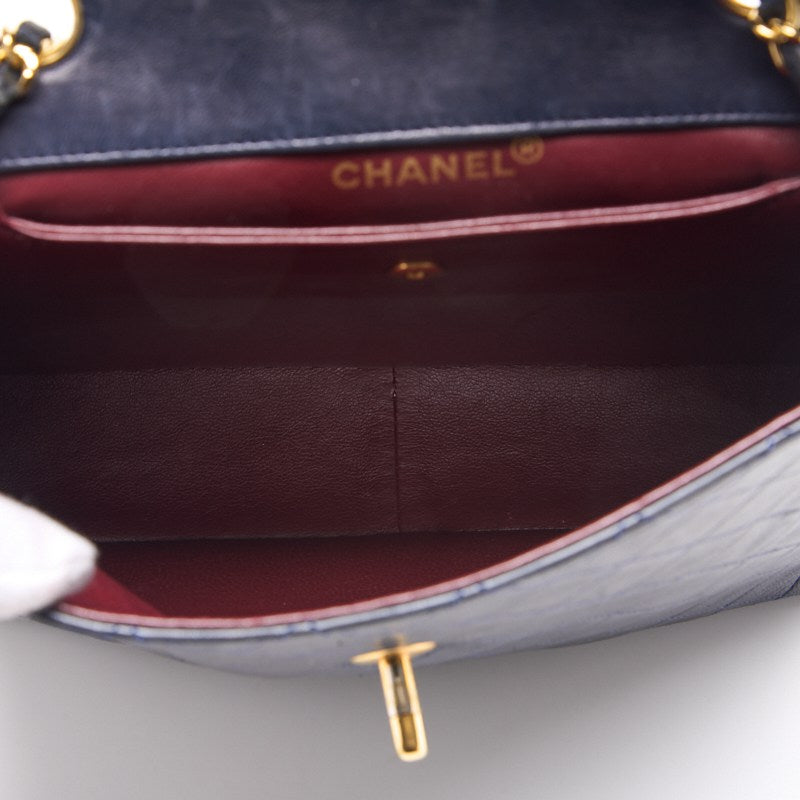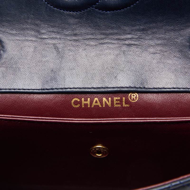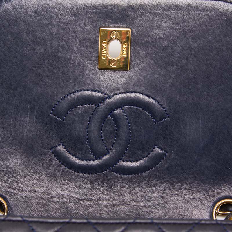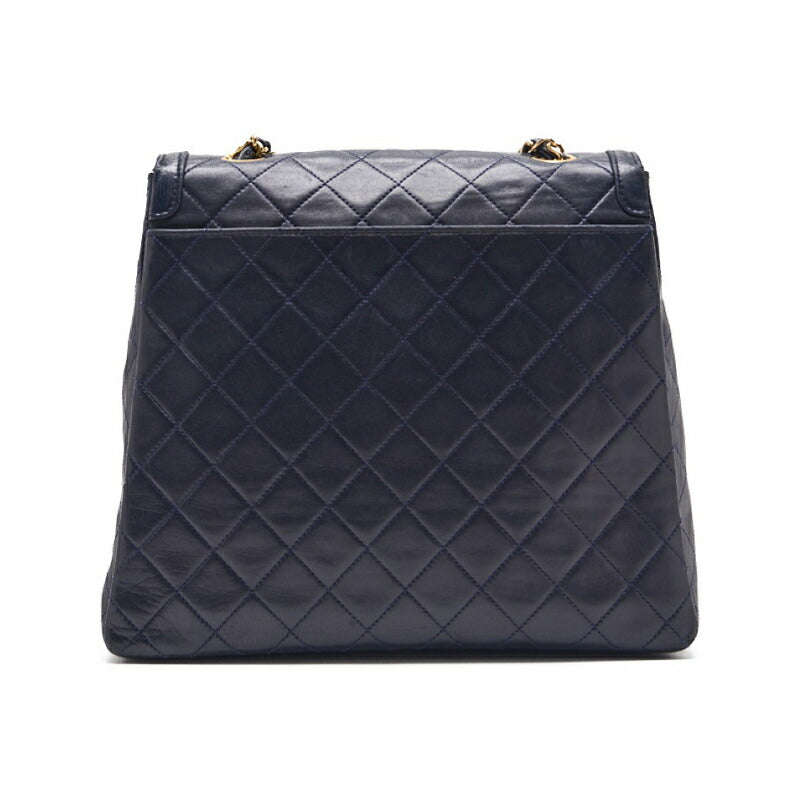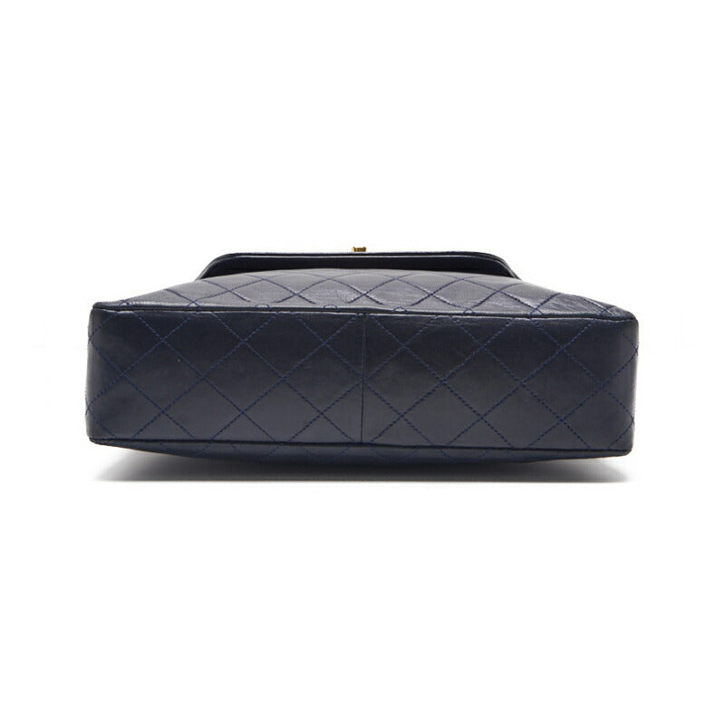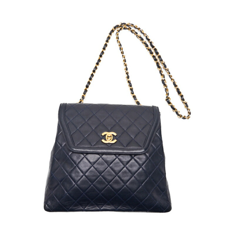 Werten Sie Ihren Stil mit der exquisiten CHANEL Matelassé-Schultertasche mit Klappe und trapezförmiger Kette auf. Diese atemberaubende, marineblaue Schultertasche aus weichem Lammleder mit luxuriösen Goldbeschlägen ist die perfekte Mischung aus Eleganz und Funktionalität.