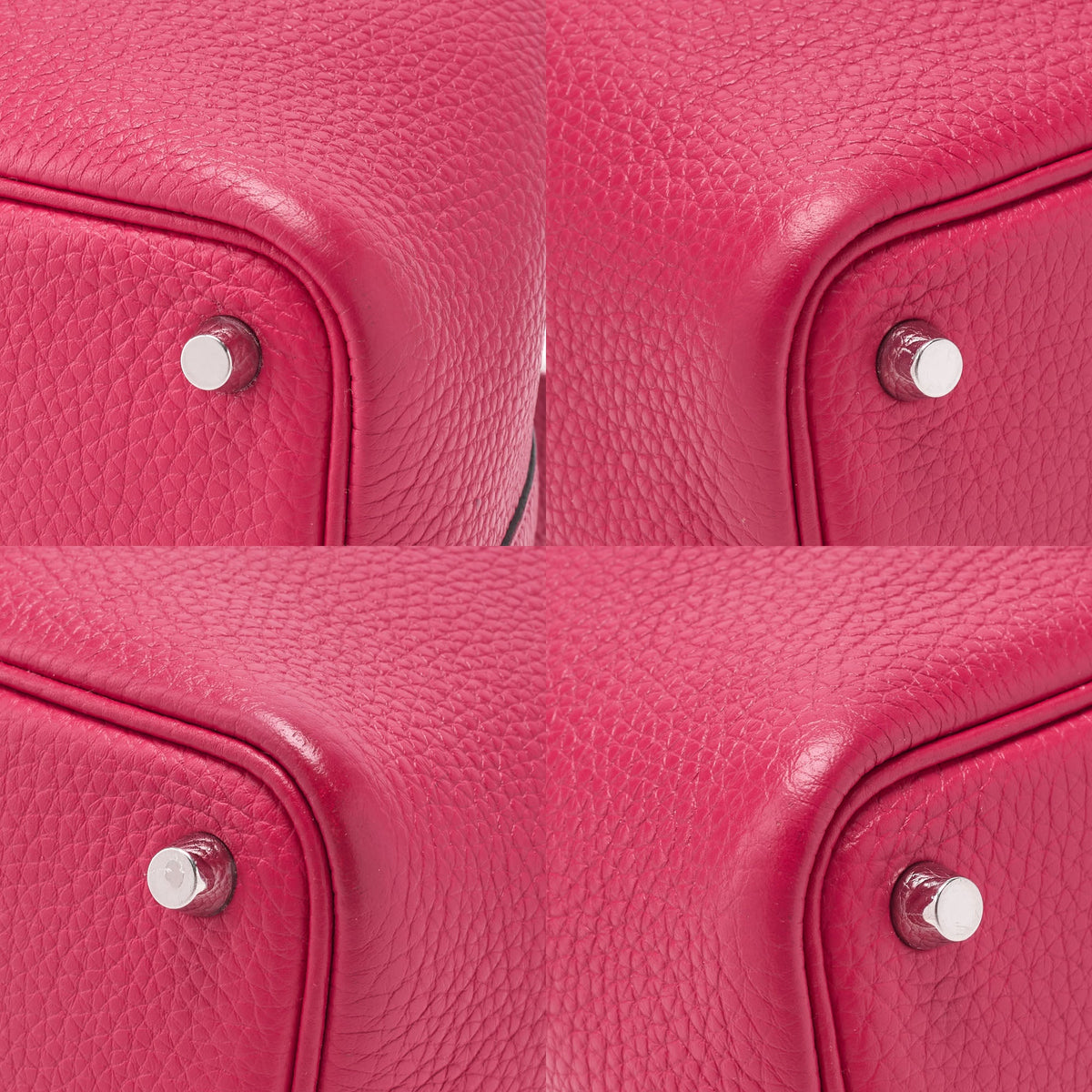 Erweitern Sie Ihre Accessoire-Kollektion mit der HERMES Picotin Lock PM Handtasche aus luxuriösem Tryon Clemence Leder in der atemberaubenden Farbkombination Framboise × Rouge Serie . Diese exquisite Handtasche mit eleganten silbernen Metallbeschlägen präsentiert die für HERMES typische Handwerkskunst.