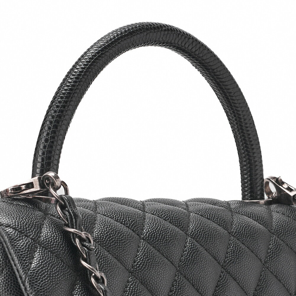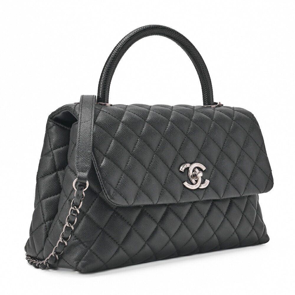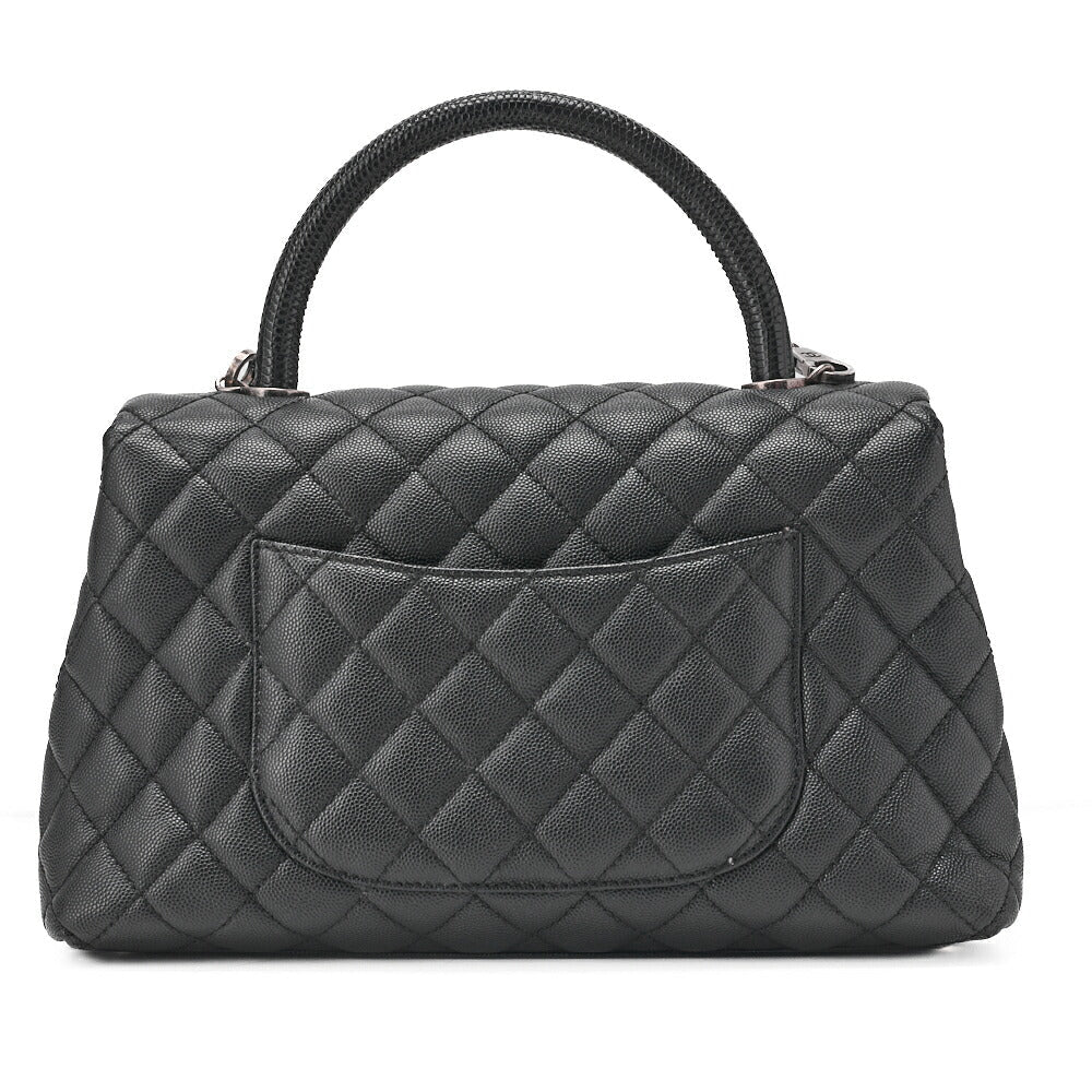 Veredeln Sie Ihren Stil mit der CHANEL Chanel Schultertasche Matelassé Coco Handle 2WAY Handtasche , einem luxuriösen Accessoire aus hochwertigem Kaviarleder und exquisitem Eidechsenleder. Diese edle schwarze Handtasche besticht durch elegante silberne Metallbeschläge und spiegelt zeitlose französische Eleganz und unvergleichliche Handwerkskunst wider.