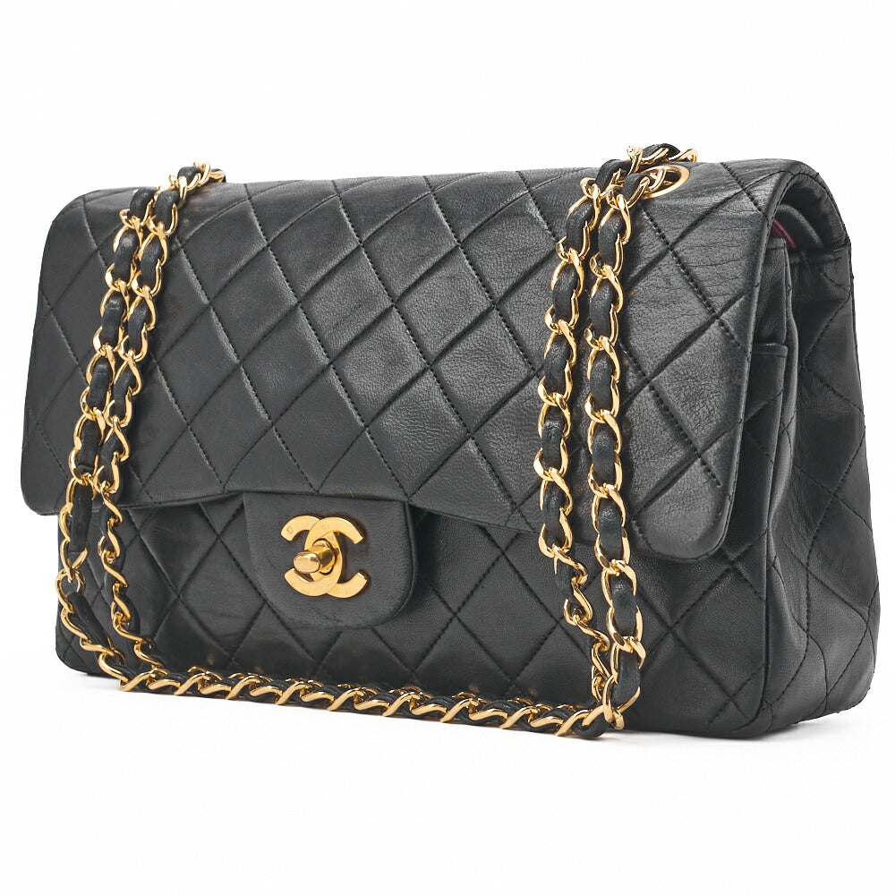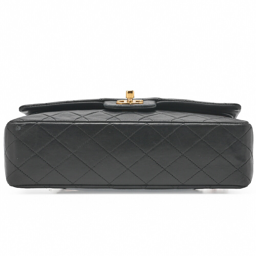 Erweitern Sie Ihre Accessoire-Kollektion mit der exquisiten CHANEL Chanel Shoulder Bag Matelasse Double Flap . Dieses zeitlose Meisterwerk aus luxuriösem Lammleder besticht durch sein atemberaubendes schwarzes Äußeres, ergänzt durch elegante goldene Metallbeschläge, was es zur perfekten Ergänzung für jedes Outfit macht.