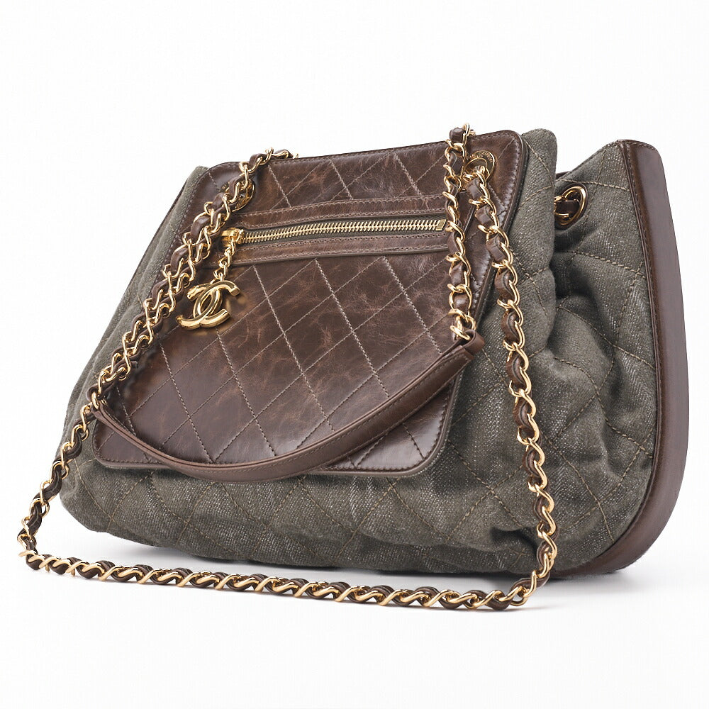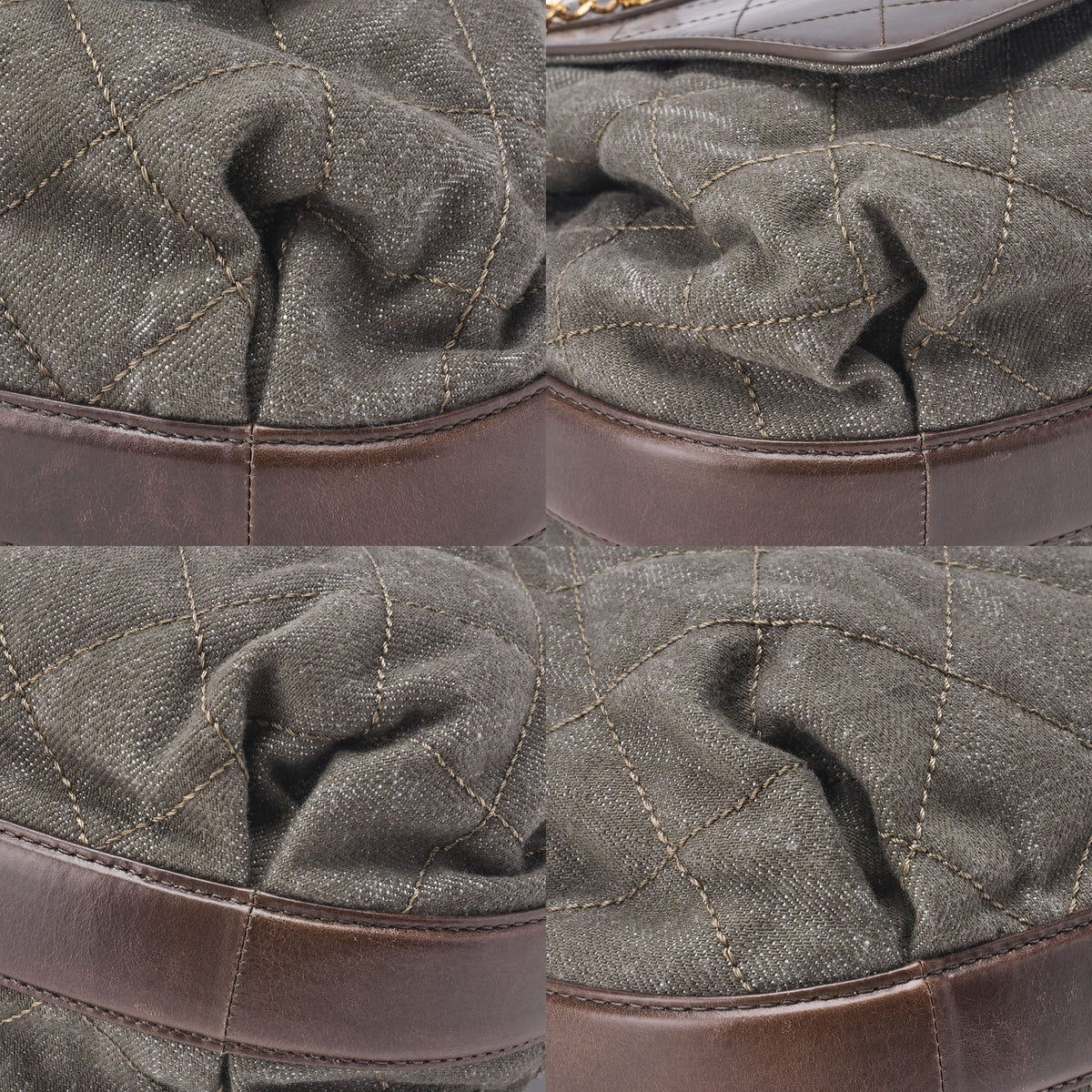Erweitern Sie Ihre Accessoire-Auswahl mit der CHANEL Schultertasche Vintage Calf – Denim Coco Charm Drawstring in einer atemberaubenden Mischung aus Braun und Grau mit exquisiten Goldbeschlägen. Dieses ikonische Stück ist nicht nur eine Tasche; es ist ein Statement von Luxus und Eleganz.