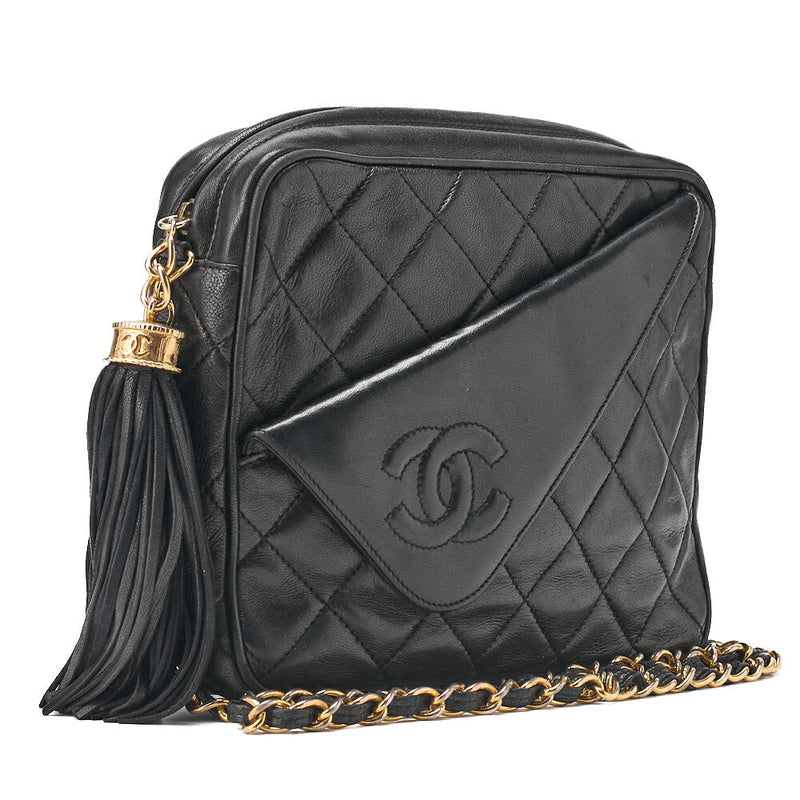 Pre-Owned Matelassé Coco Mark Fringe Chain Shoulder Lambskin Black Gold-Tone Hardware, Pre-Owned