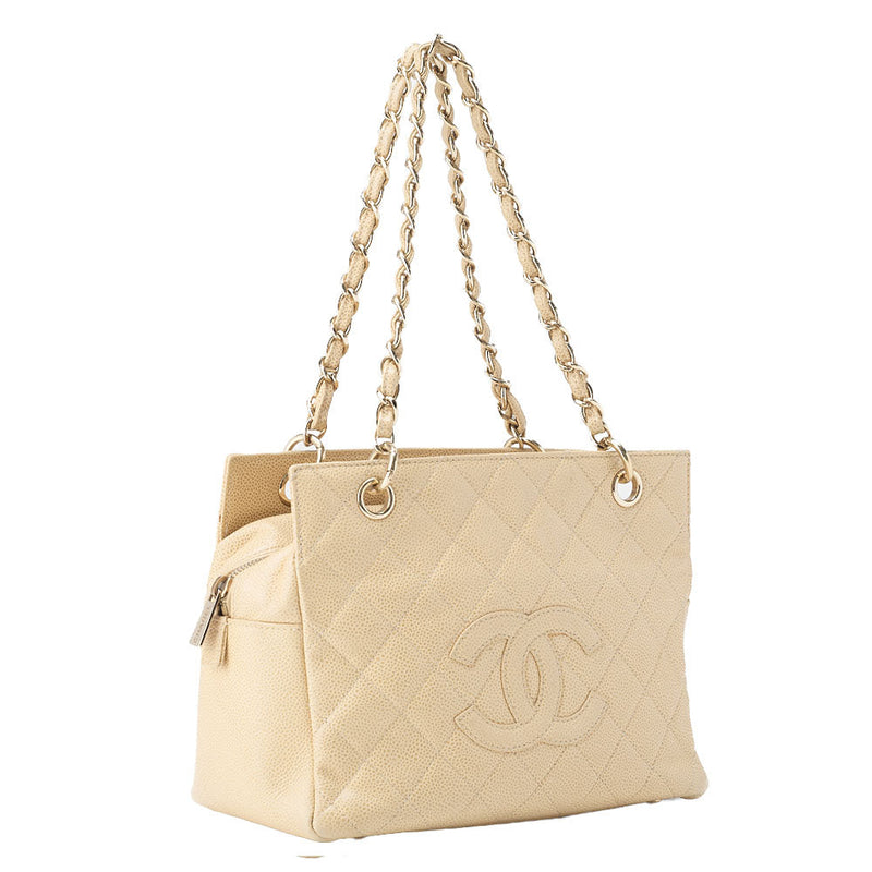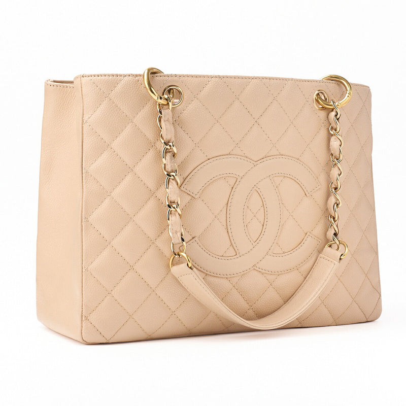 Gebrauchte Tragetasche Matelassé GST Doppelkette Kaviarhaut Beige Goldfarbene Hardware Gebraucht