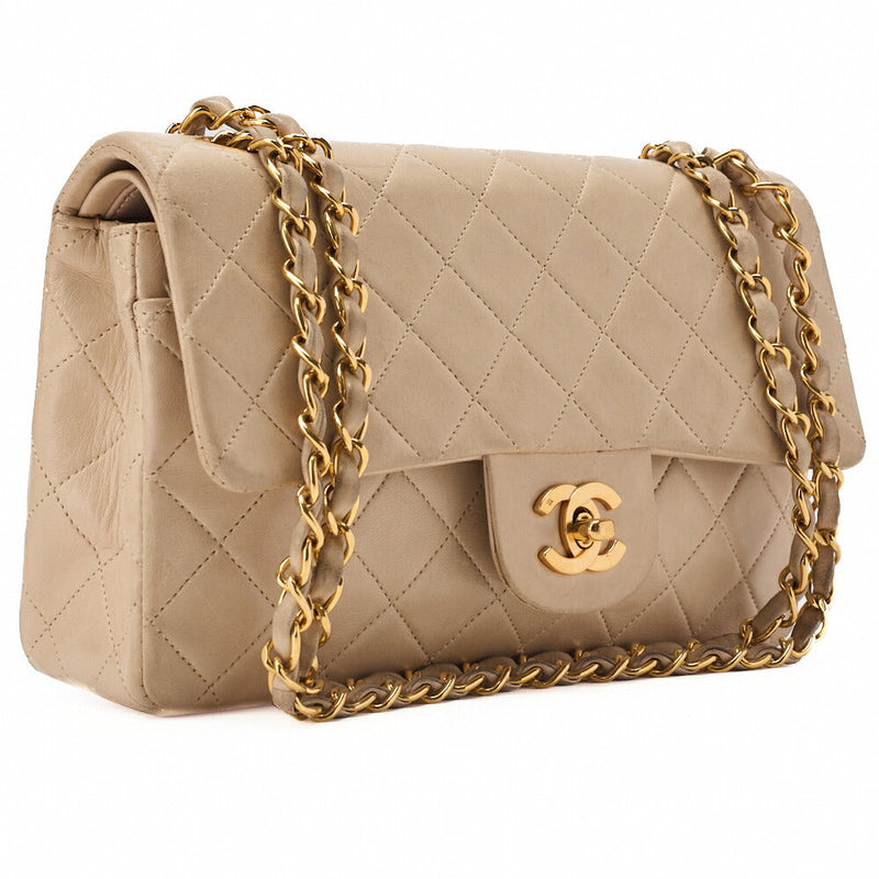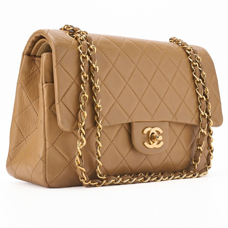 Pre-Owned Schultertasche Matelassé Doppelklappe Lammleder Beige Goldfarbene Hardware Pre-Owned