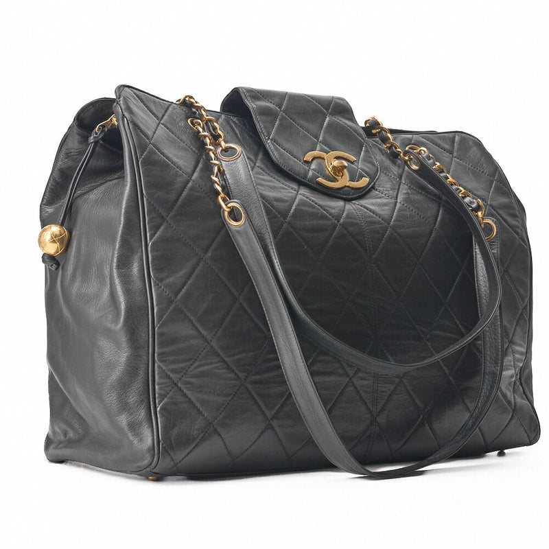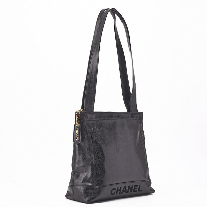 Gebrauchte Umhängetasche, Matelassé, Kreisförmiger Coco-Anhänger, Kaviarhaut, Schwarz, Goldfarbene Metallteile, Gebraucht