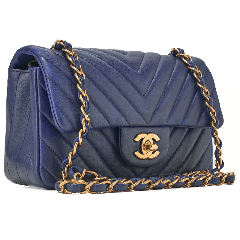 Pre-Owned Shoulder Bag Lambskin V Stitch Navy Coco Mark Single Flap Gold-Tone Hardware, Pre-Owned