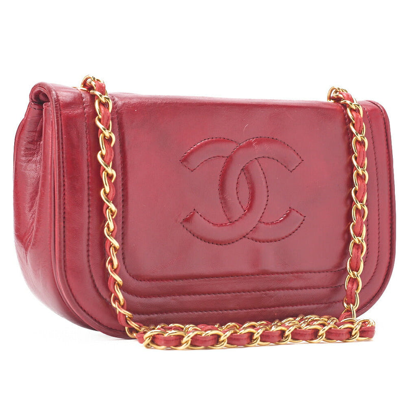 Pre-Owned Chain Shoulder Full Flap Coco Mark Lambskin Red Gold-Tone Hardware, Pre-Owned