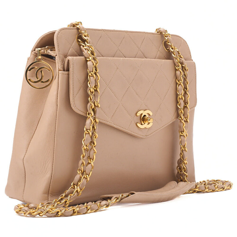 Pre-Owned Chain Shoulder Bag Matelassé Outside Flap Fringe Chain Shoulder Lambskin Beige Gold-Tone Hardware, Pre-Owned