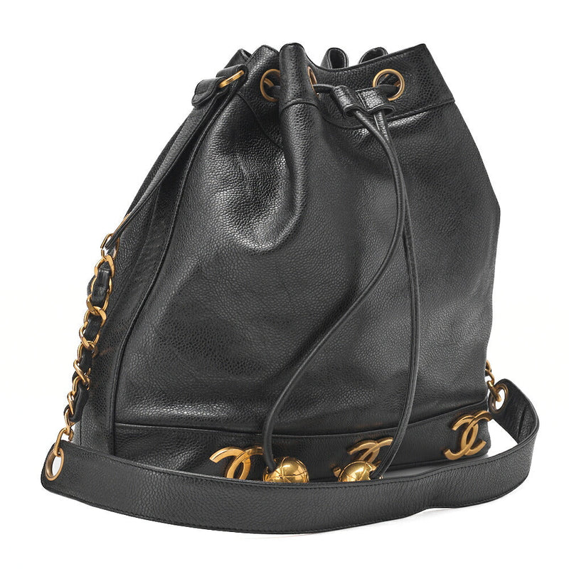 Gebrauchte Schultertasche mit Kette, Caviar Skin, dreifacher Coco-Kordelzug, Kugelanhänger, schwarze goldfarbene Metallteile, gebraucht