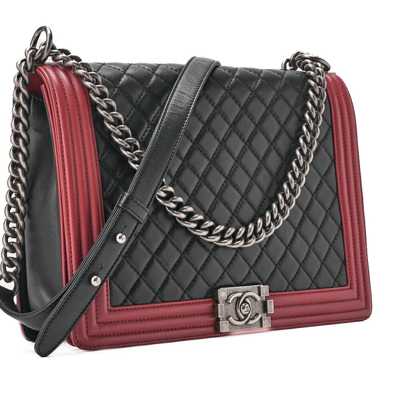 Pre-Owned Boy Matelassé Kette Schulter Lammleder Schwarz & Rot Große Größe Silberfarbene Hardware, Pre-Owned
