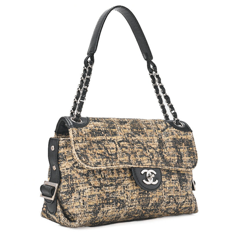 Gebrauchte Schultertasche mit Drehverschluss, Tweed-Muster, Canvas, zweifarbig, silberfarbene Hardware, gebraucht