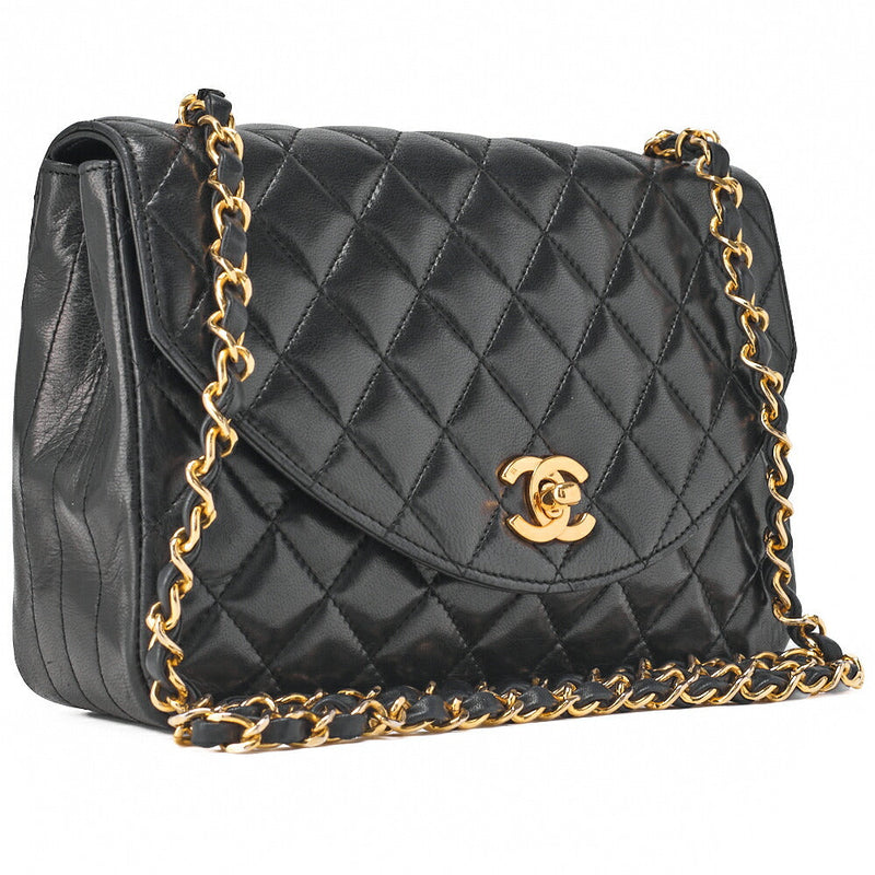Pre-Owned Kette Schultertasche Matlasse Lammleder Schwarz Runde Klappe Drehverschluss Goldfarbene Hardware, Pre-Owned