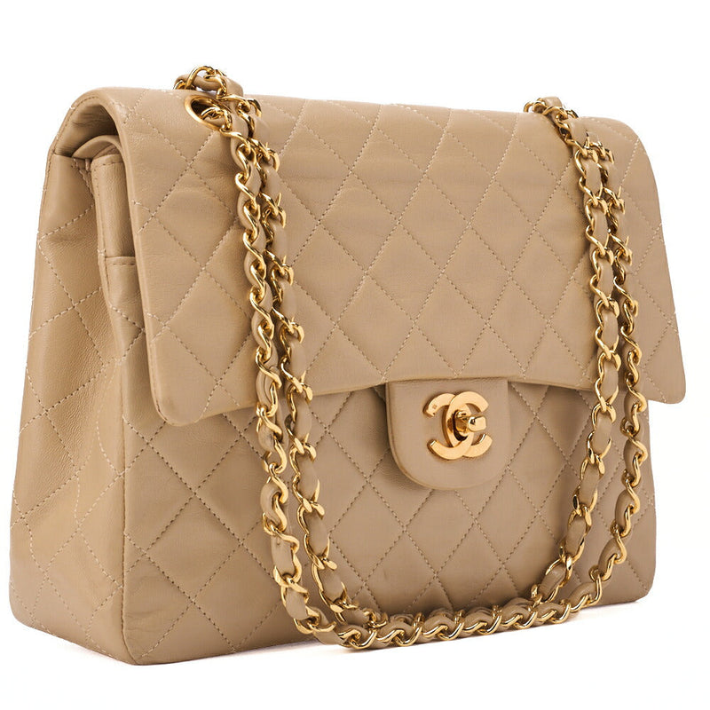 Pre-Owned Matelassé Double Flap 25cm Chain Shoulder Lambskin Beige Gold-Tone Hardware, Pre-Owned