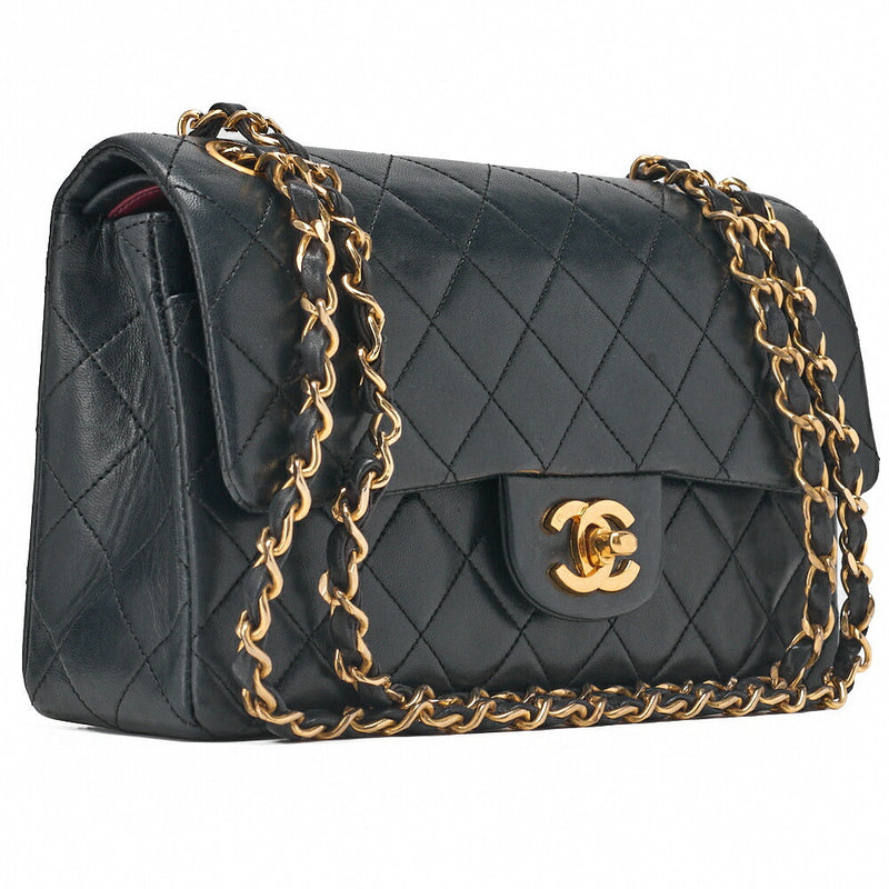 Pre-Owned Chain Shoulder Bag Matelassé Double Flap 23cm Lambskin Dark Navy Gold-Tone Hardware, Pre-Owned