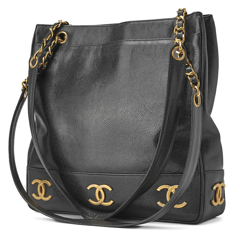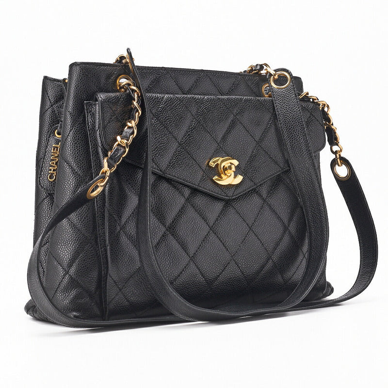 Gebrauchte Schultertasche Triple Coco Doppelkette Schulter Caviar Skin Schwarz Goldfarbene Hardware Gebraucht