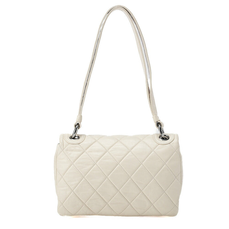 Gebrauchte Umhängetasche, Matelassé V-Flap, Lammleder, Weiß, Silberfarbene Metallteile, Gebraucht