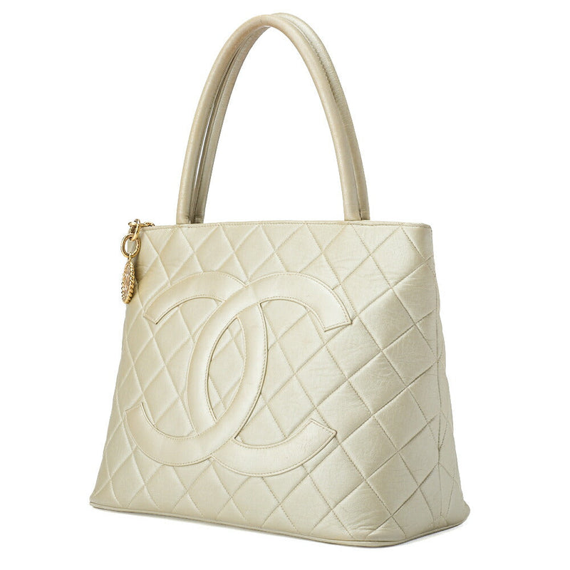 Pre-Owned Schultertasche Tote Bag Matelassé Lammleder Weiß Goldfarbene Hardware Pre-Owned
