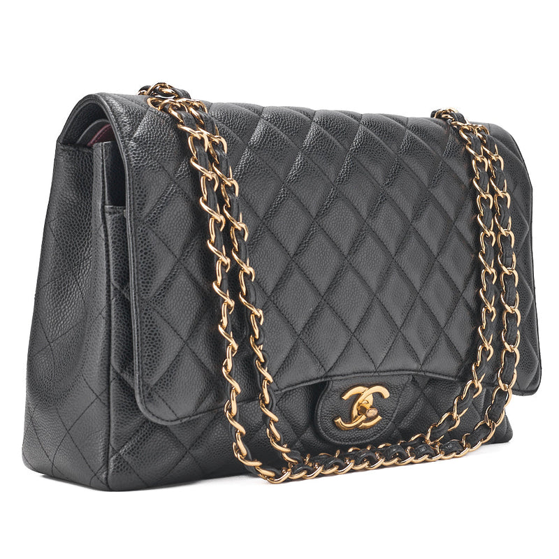 Gebrauchte Umhängetasche, Deca Matelassé, Doppelklappe, Kaviarhaut, Schwarz, Goldfarbene Metallteile, Gebraucht