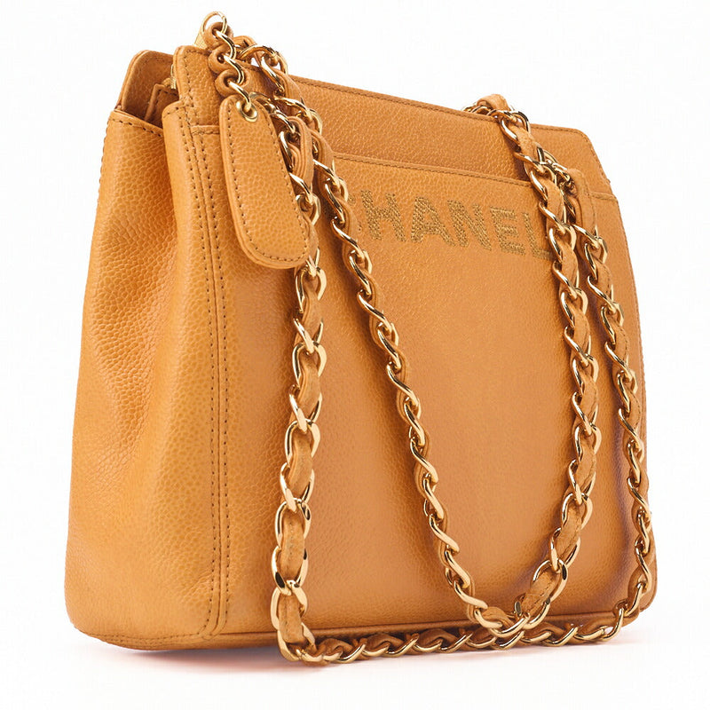 Gebrauchte Schultertasche mit Logo-Markierung, doppelte Kette an der Schulter, Kaviarhaut, Beige, goldfarbene Hardware, gebraucht