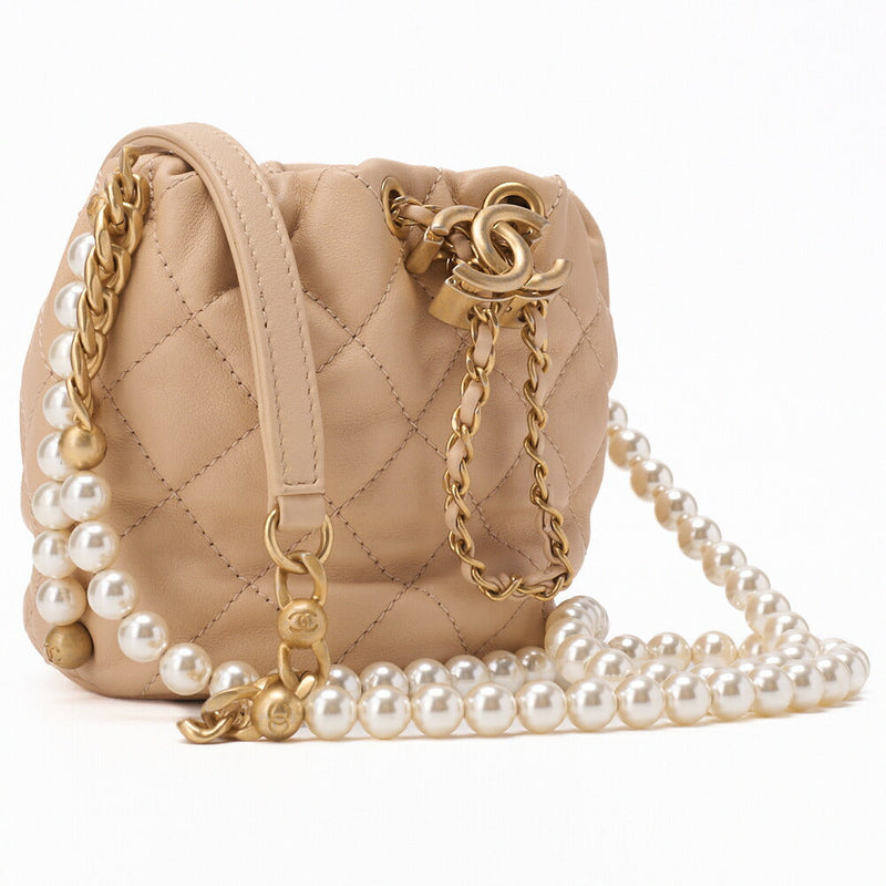 Gebrauchte Umhängetasche, Matelassé, Kordelzug, Lammleder, Beige, Goldfarbene Metallteile, Gebraucht