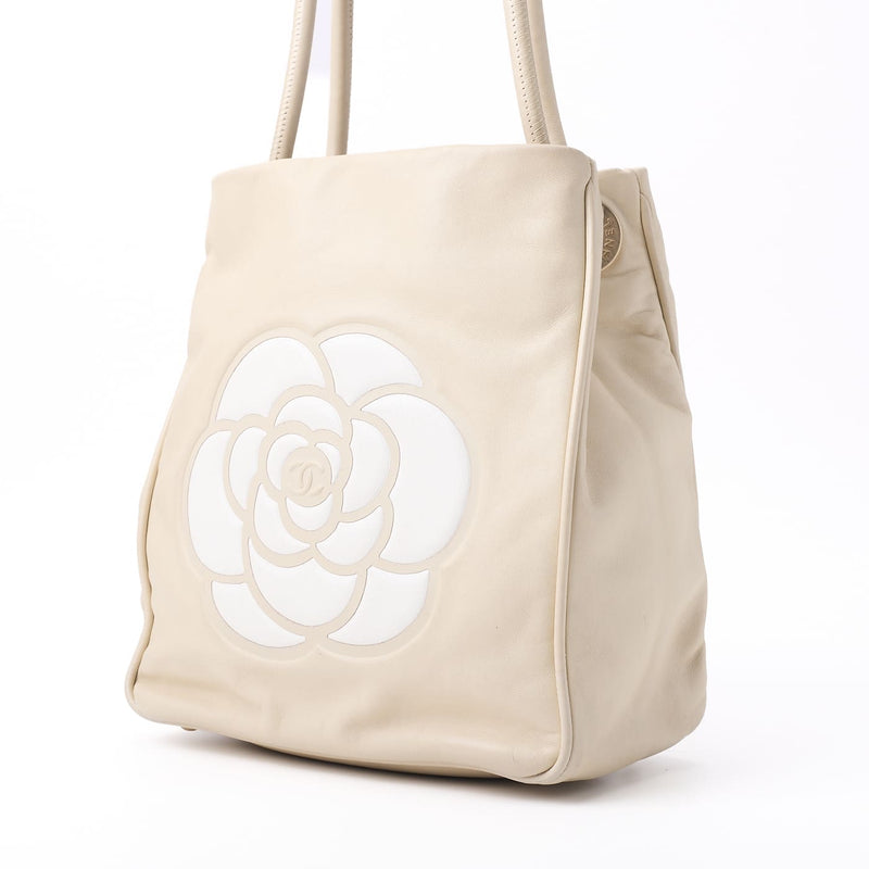 Gebrauchte Tragetasche Camellia Line Lammleder Elfenbein Goldfarbene Hardware Gebraucht