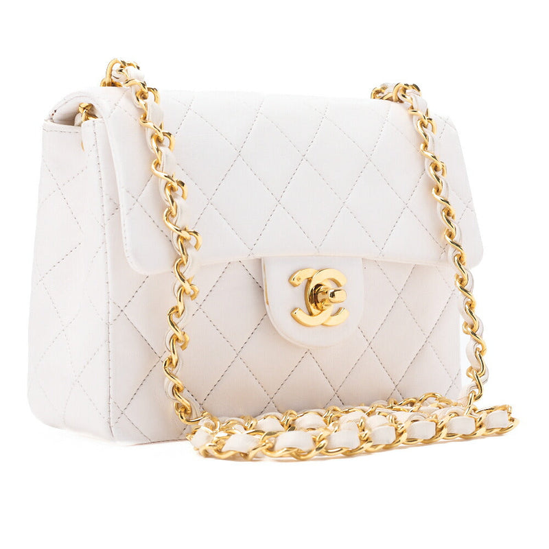 Pre-Owned Kette Schultertasche Mini Matelassé 18cm Lammleder Weiß Einzelklappe Drehverschluss Goldfarbene Hardware, Pre-Owned