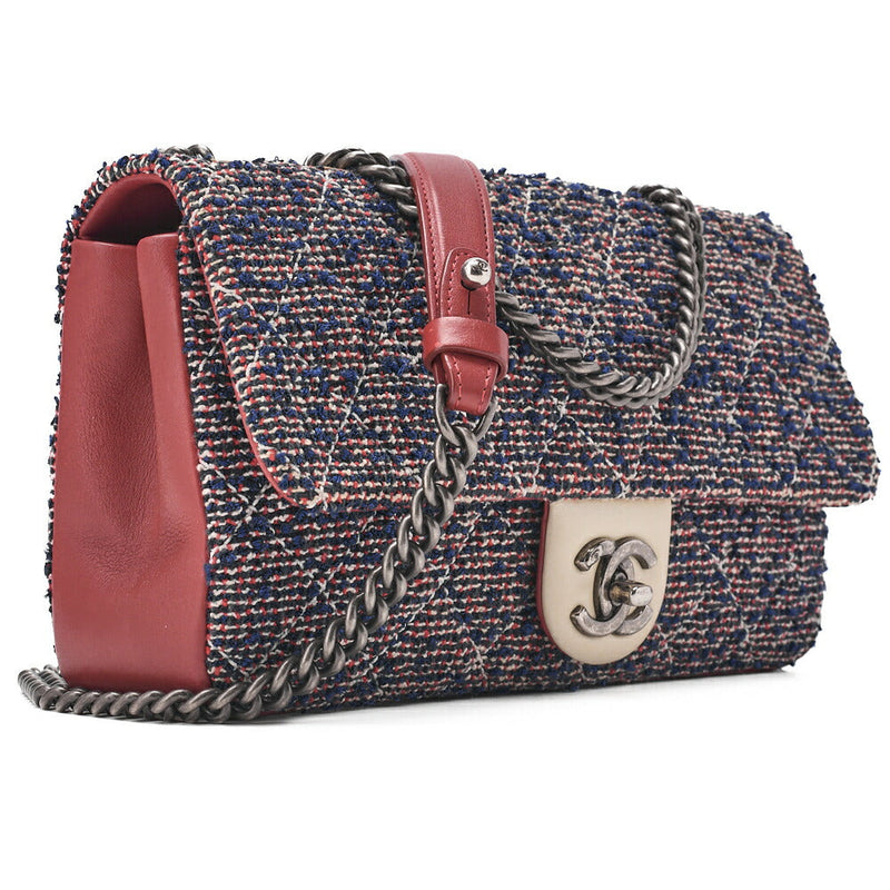 Gebrauchte Umhängetasche Matelassé Single Flap Tweed Rot & Marine Silberfarbene Hardware, Gebraucht