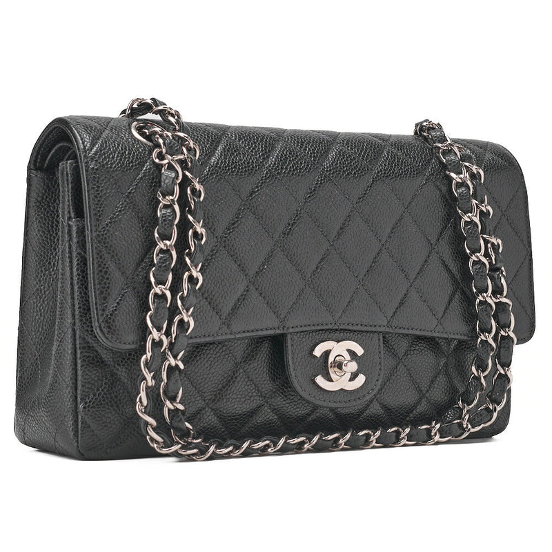Gebrauchte Matlasse Doppelklappe 25cm Kette Schulter Kaviar Haut Schwarz Silberfarbene Hardware, Gebraucht