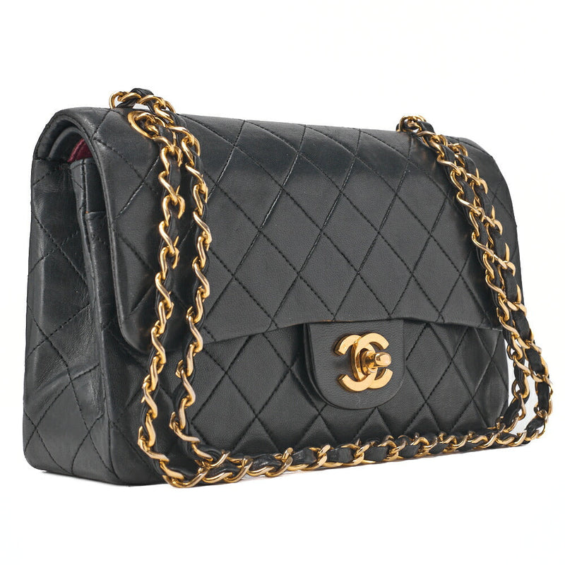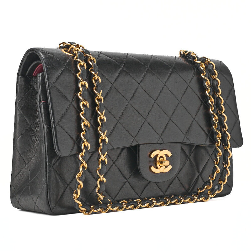 Pre-Owned Kette Schultertasche Matlasse Doppelklappe 23cm Lammleder Schwarz Goldfarbene Hardware, Pre-Owned