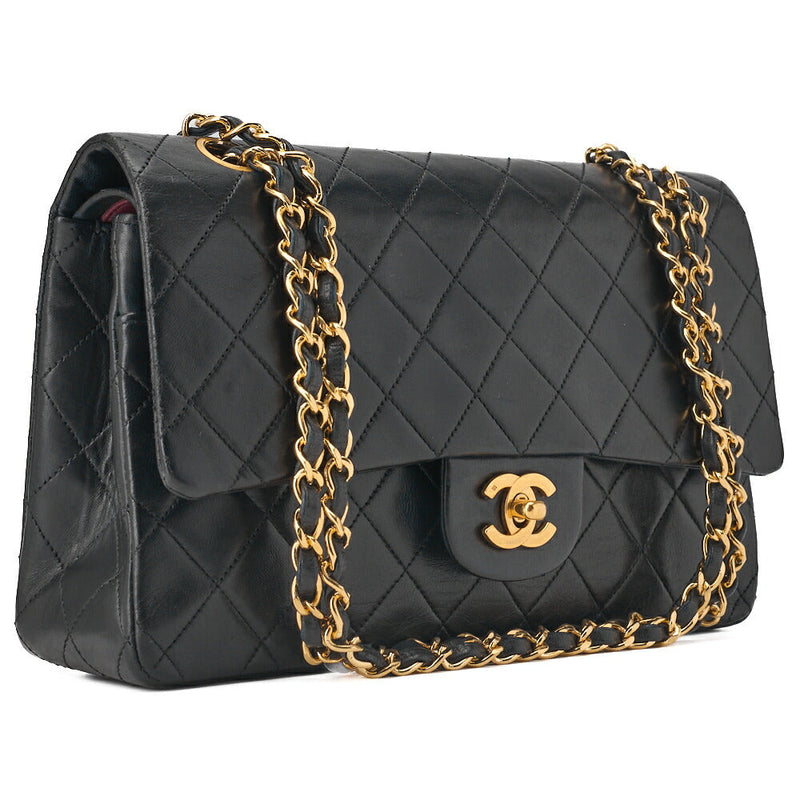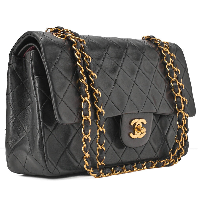 Pre-Owned Schultertasche Matelassé Doppelklappe Lammleder Schwarz Goldfarbene Hardware Pre-Owned