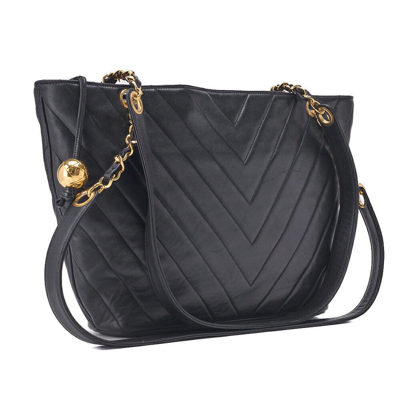 Gebrauchte Umhängetasche, V-Stich-Kugelanhänger, Kettenschulter, Lammleder, Schwarz, goldfarbene Metallteile, gebraucht