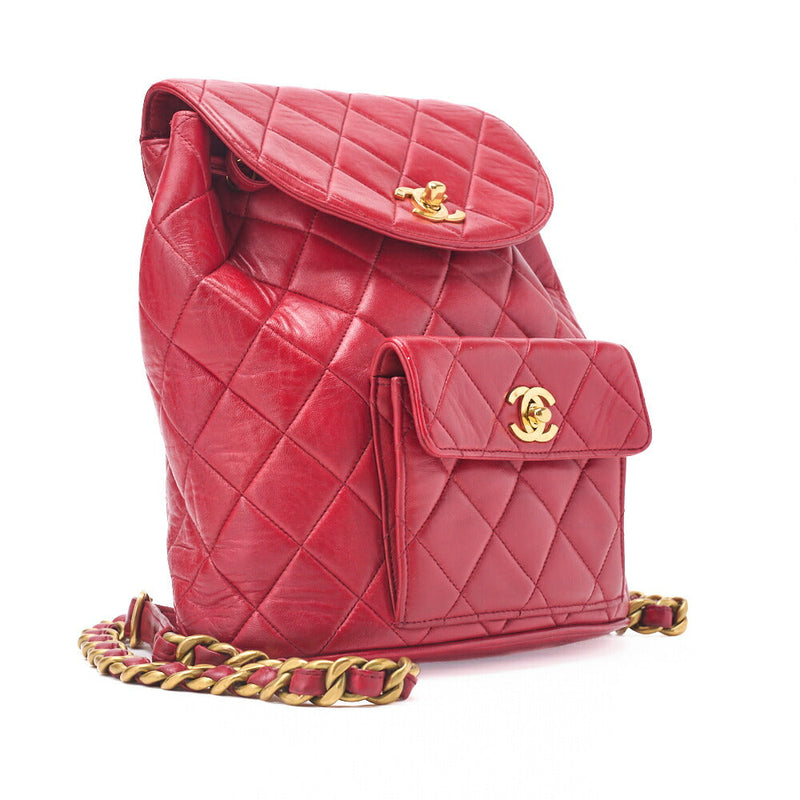 Gebrauchte Schulter-Rucksacktasche Matelassé Außenklappe Drehverschluss Lammleder Rot Goldfarbene Hardware Gebraucht