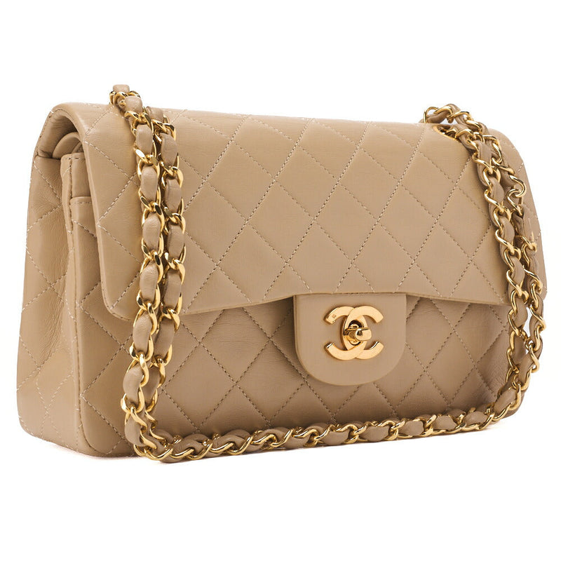 Pre-Owned Schultertasche Matelassé Doppelklappe Lammleder Beige Goldfarbene Hardware Pre-Owned
