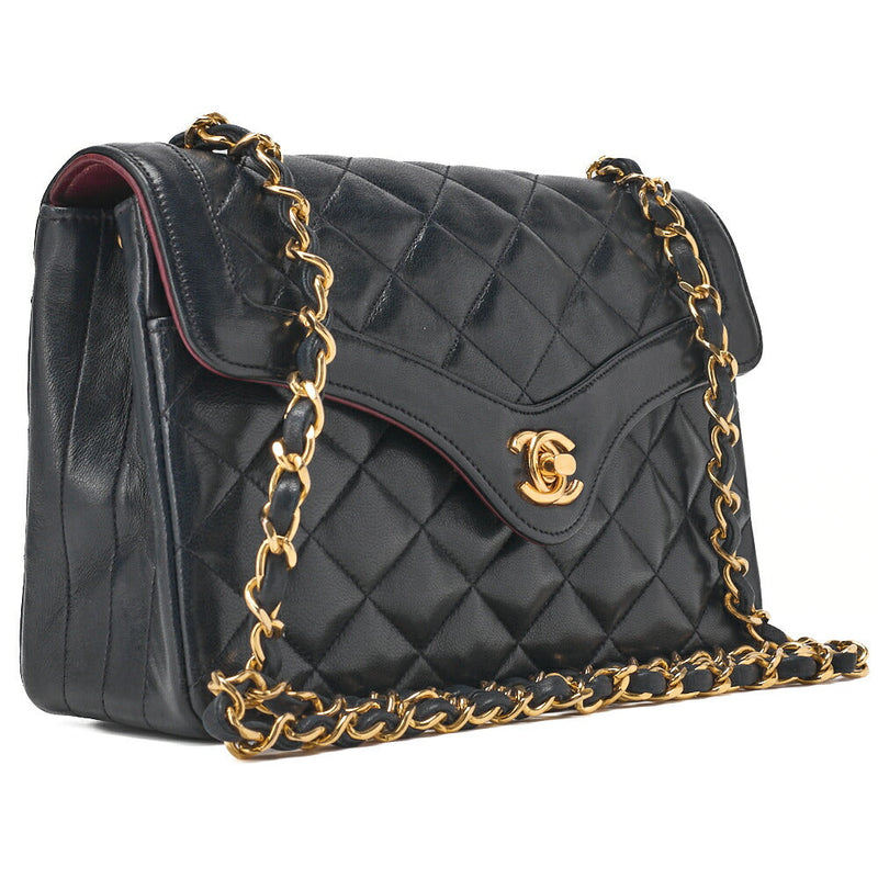 Pre-Owned Kette Schultertasche Matelassé Doppelklappe Lammleder Schwarz Goldfarbene Hardware Pre-Owned