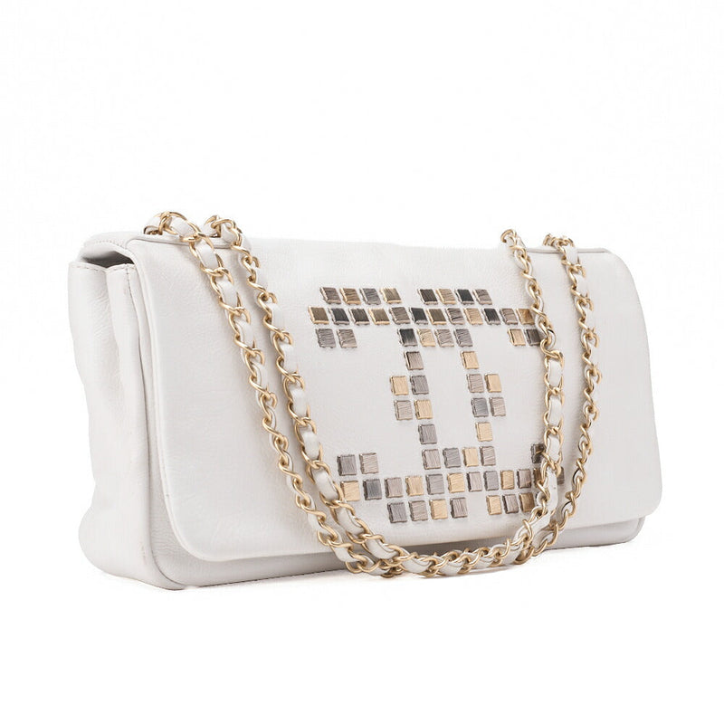 Pre-Owned Schultertasche Coco Mark Nietenbesetzte Full Flap Leder Weiß Goldfarbene Hardware Pre-Owned